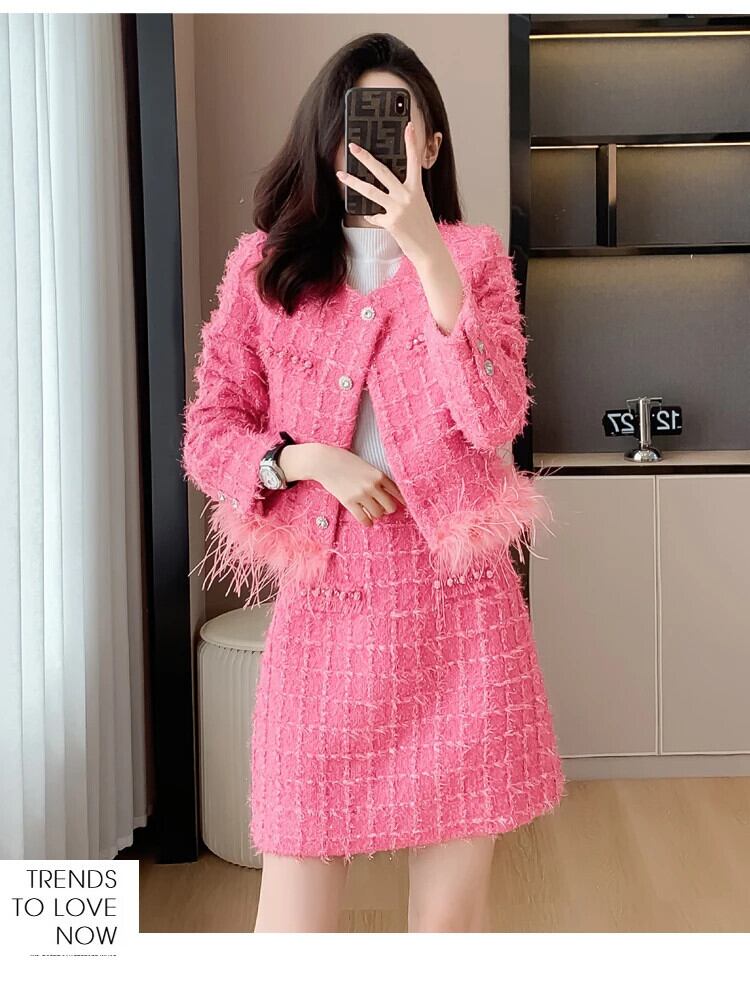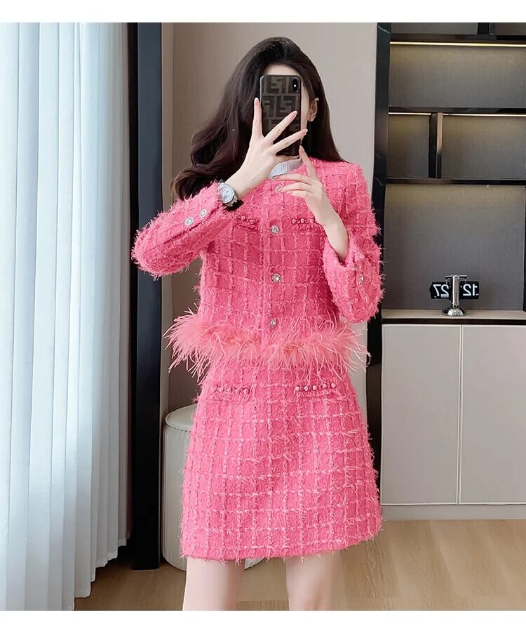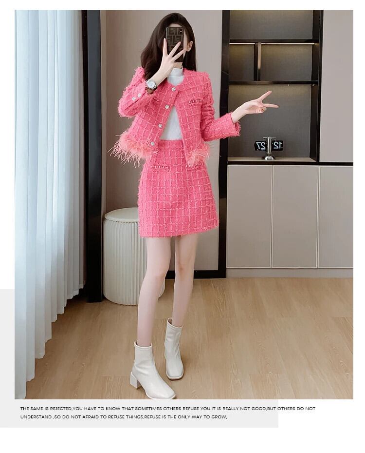 ストリート高級ブライトツイードツーピースセットフェザーテルショートジャケットコート+スカートセット甘い2ピース衣装 大人ガーリー スウィート キュート カジュアル シルク