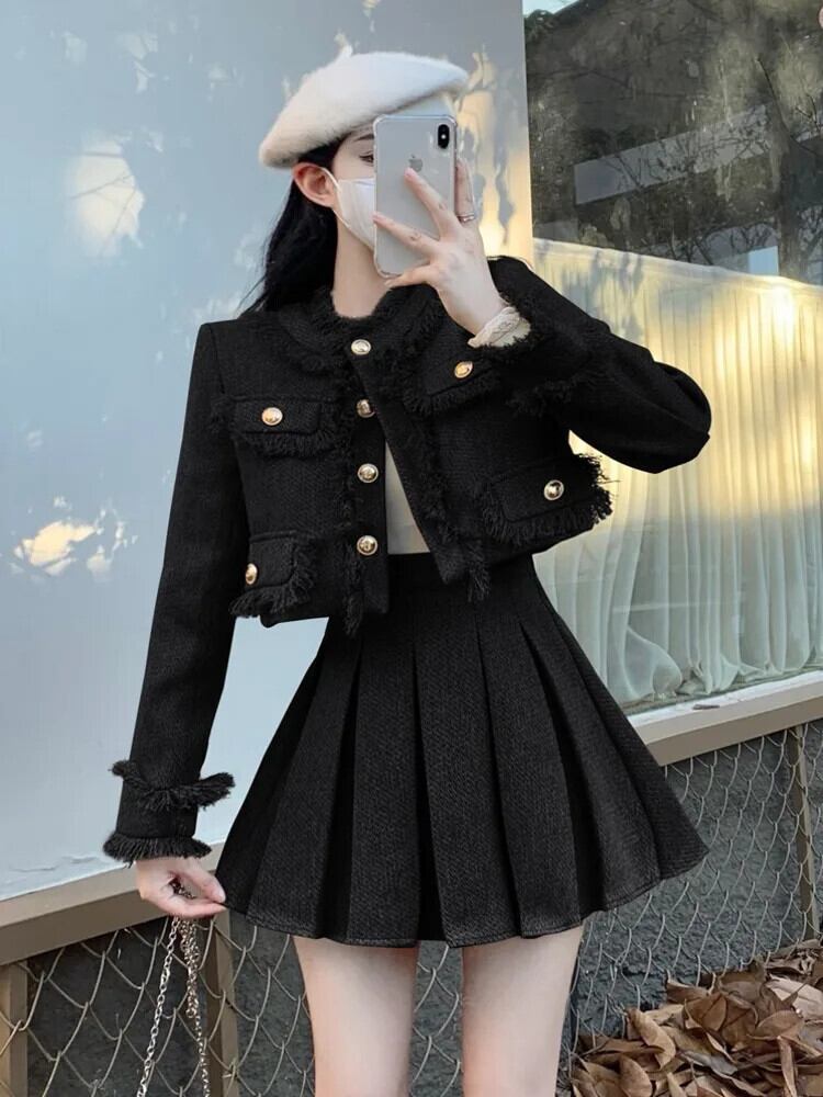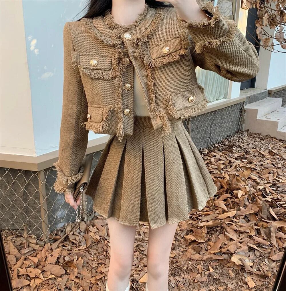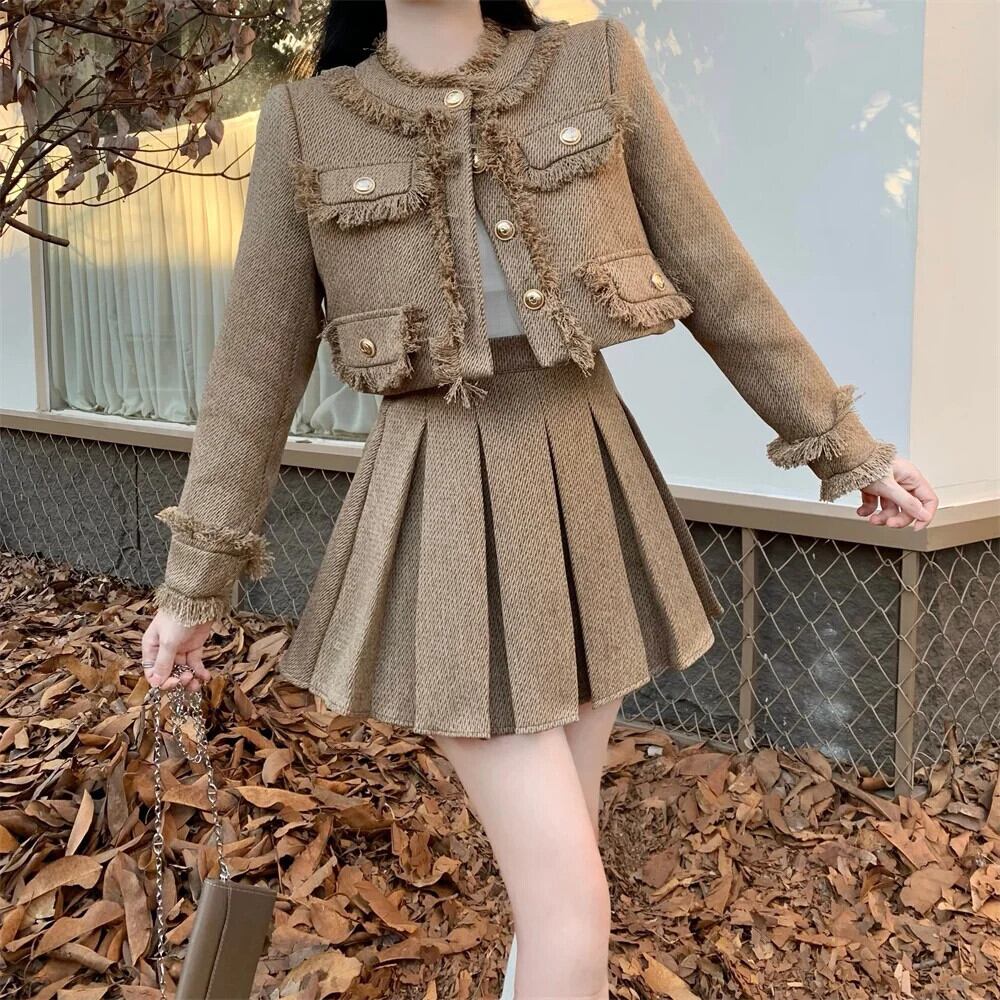 小さフレグランスツイード 2 点セットテルウールジャケットコート + プリーツスカート 2 点セット衣装