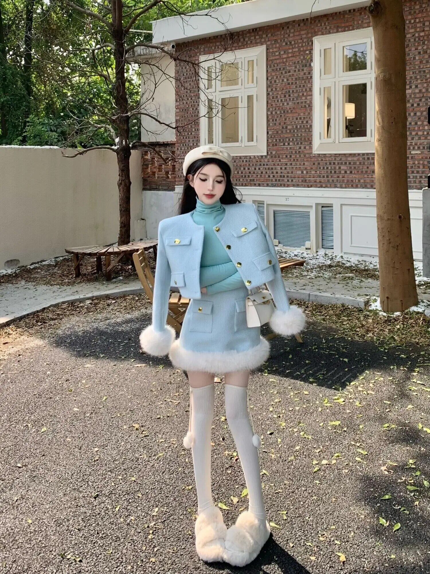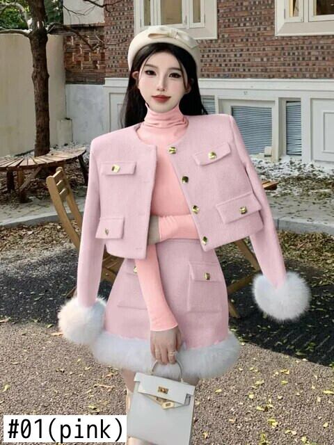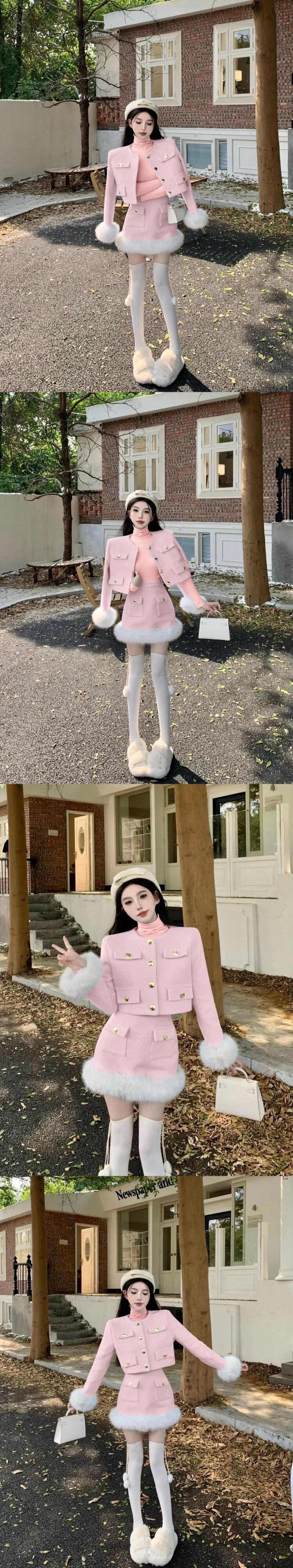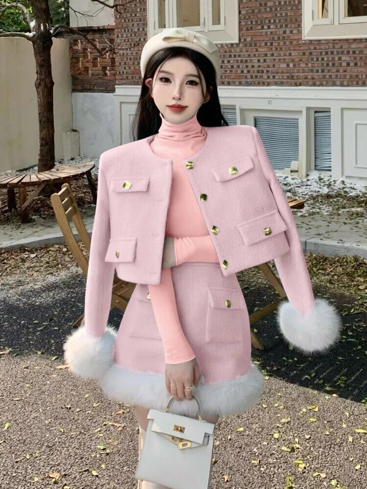 小さ香りツーピースセットショートジャケットコート + スカートスーツ甘くて厚く暖かい冬 2 ピース衣装 大人ガーリー スウィート キュート カジュアル ウィンター 冬物