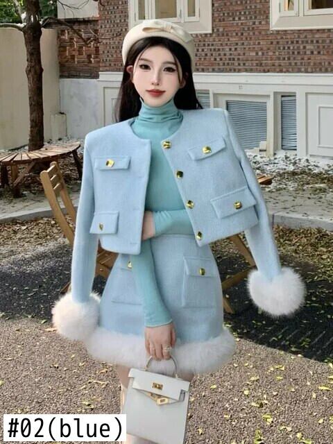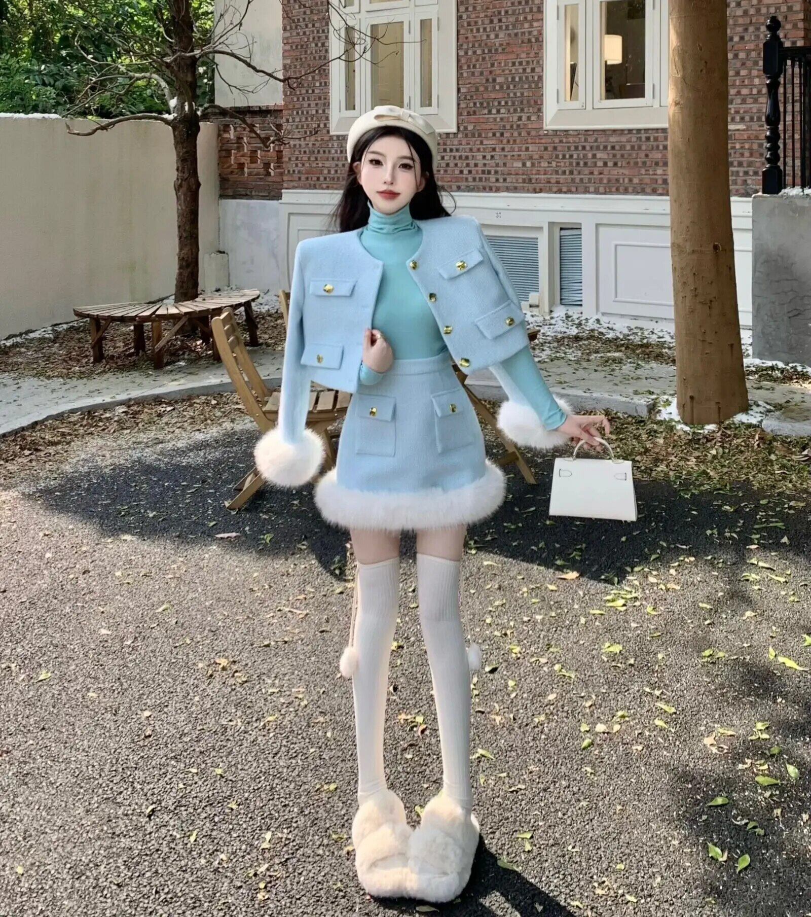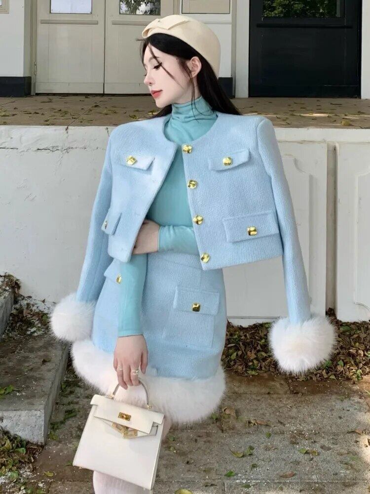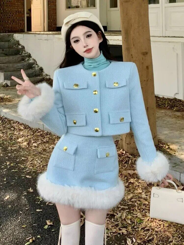 小さ香りツーピースセットショートジャケットコート + スカートスーツ甘くて厚く暖かい冬 2 ピース衣装 大人ガーリー スウィート キュート カジュアル ウィンター 冬物