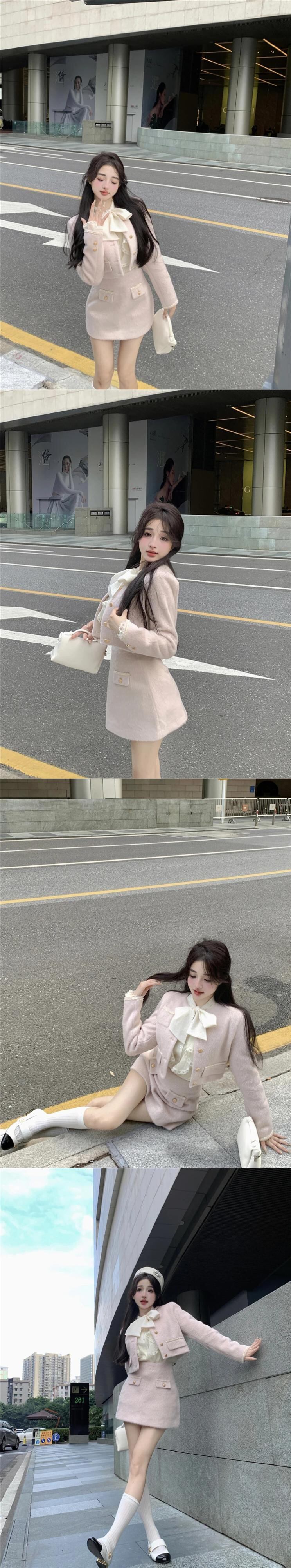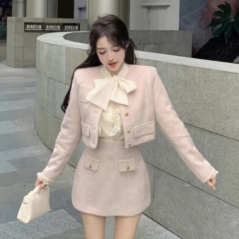 秋甘い小さ香り 3 点セットショートジャケットコート + シャツ + スカートスーツ 3 点セット 大人ガーリー スウィート キュート カジュアル オータム 秋物