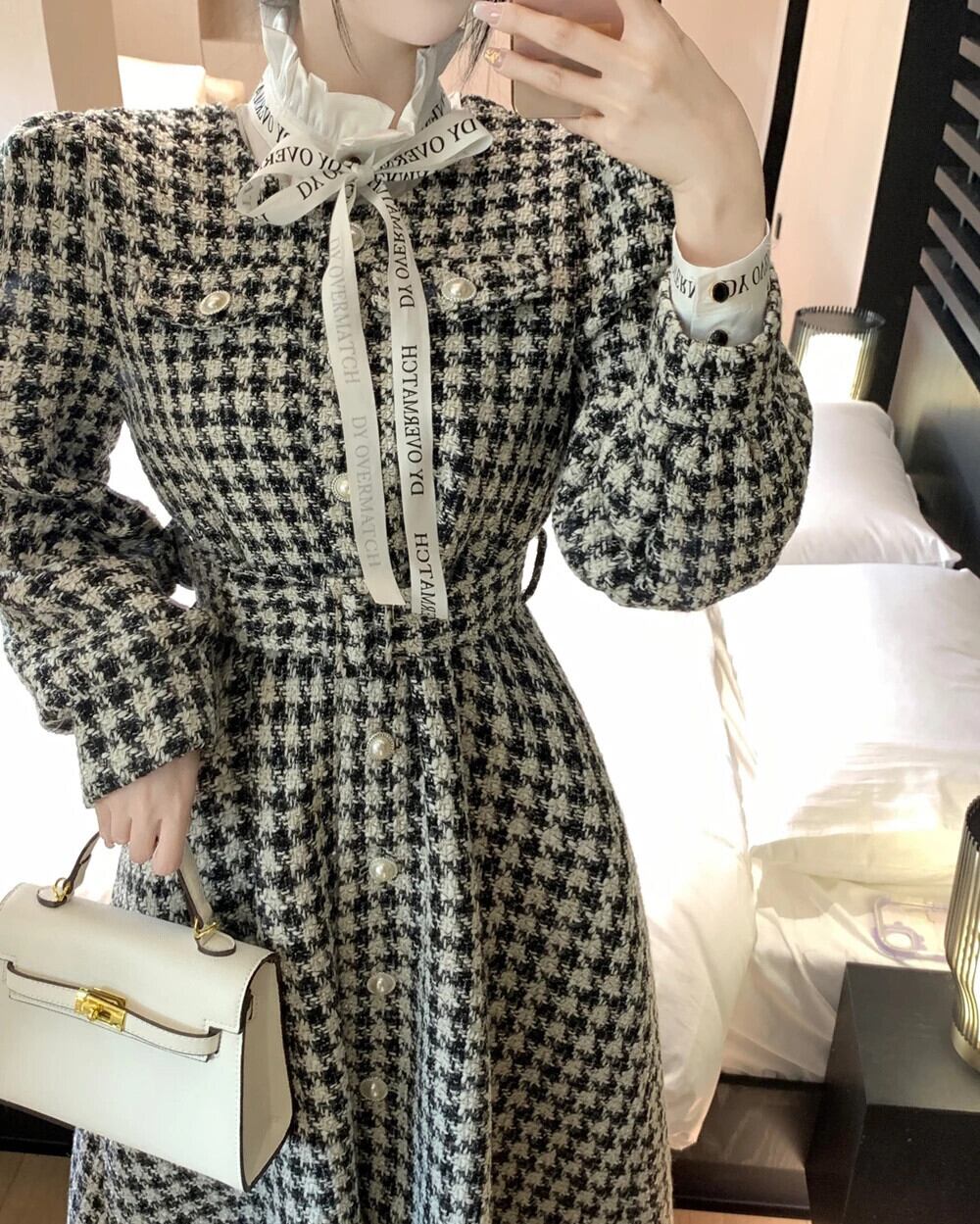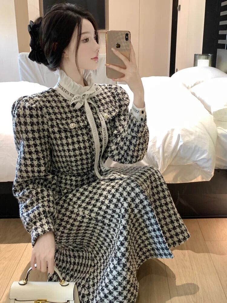 秋冬フレンチスモールフレグランドレス千鳥格子シングルブレストスリムウエストパーティーロングドレス ウィンター 冬物