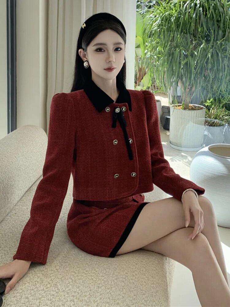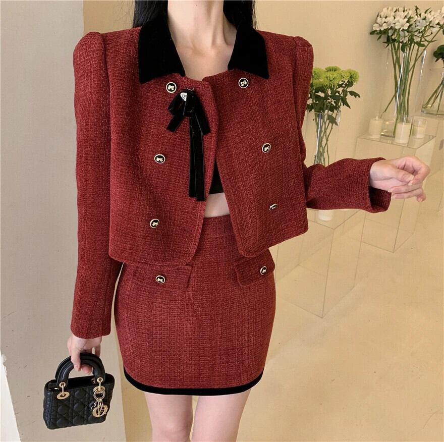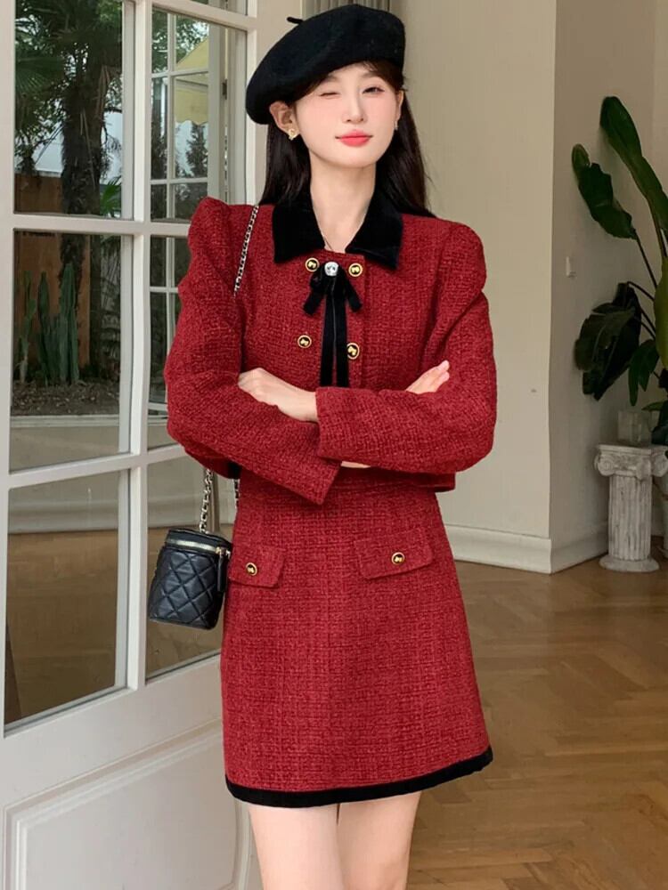 秋冬赤ツーピースセットショートジャケットコート+プリーツスカート2点セット衣装 レッド オータム 秋物 ウィンター 冬物