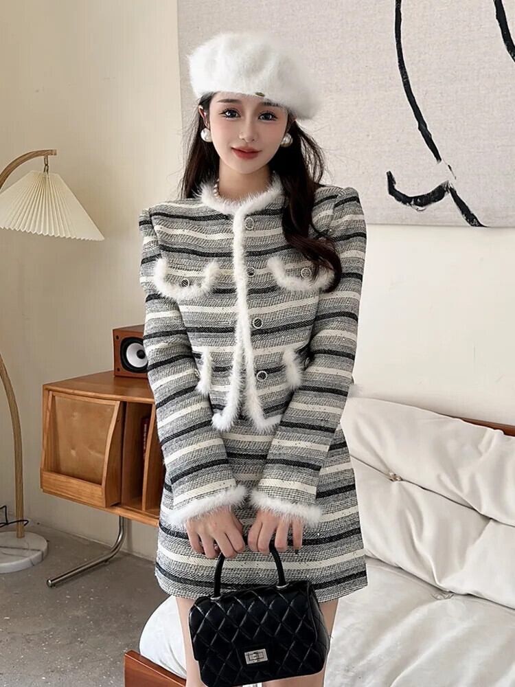 高級ツイード 2 点セットショートジャケットコート + スカートスーツスウィートミンクヘア 2 ピース衣装 大人ガーリー キュート カジュアル