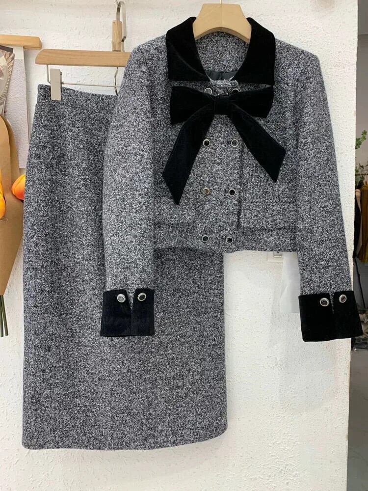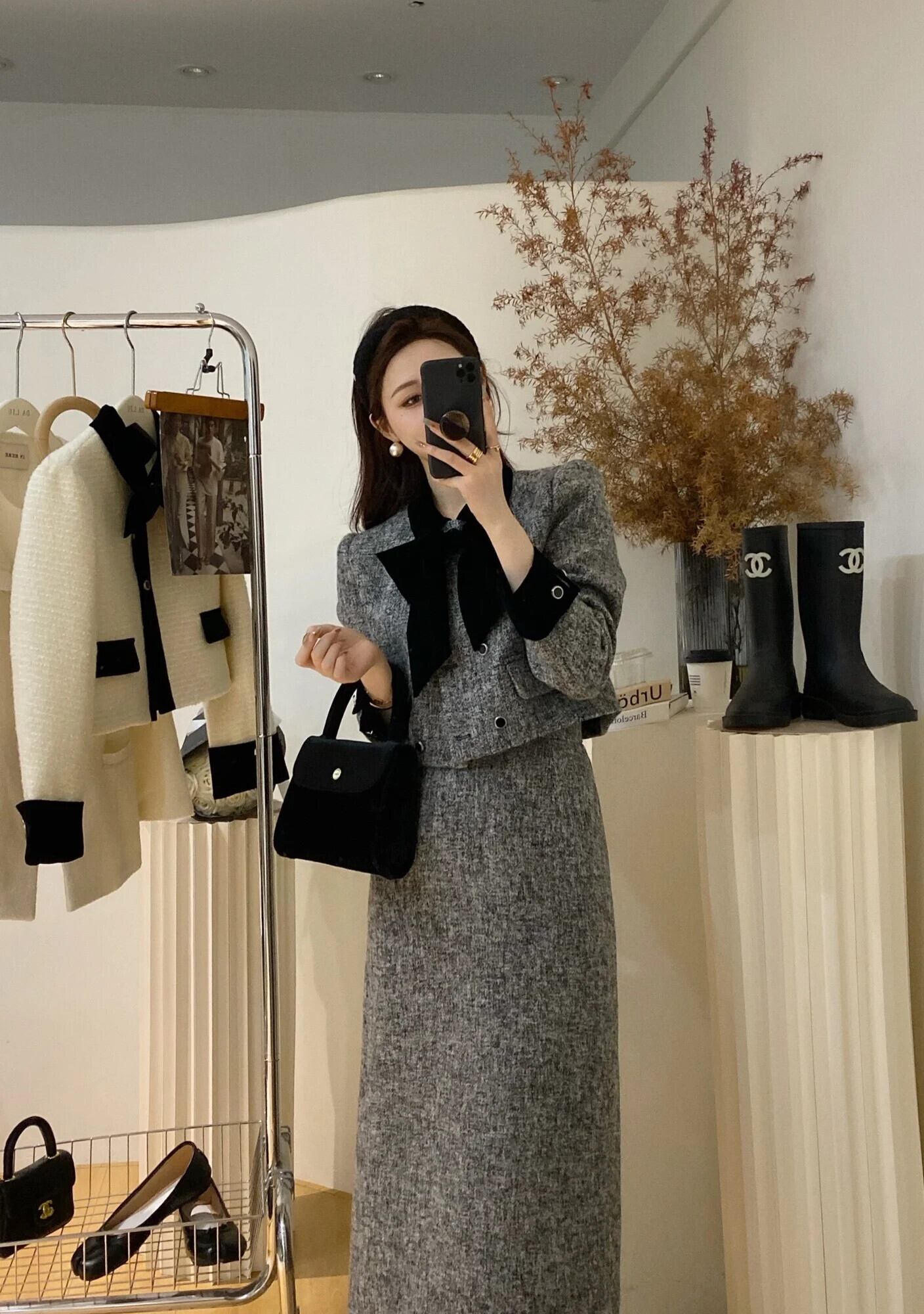 秋冬ツーピースセットボウジャケットコート+ロングスカートセット小さフレグランス2ピーススーツ リボン オータム 秋物 ウィンター 冬物