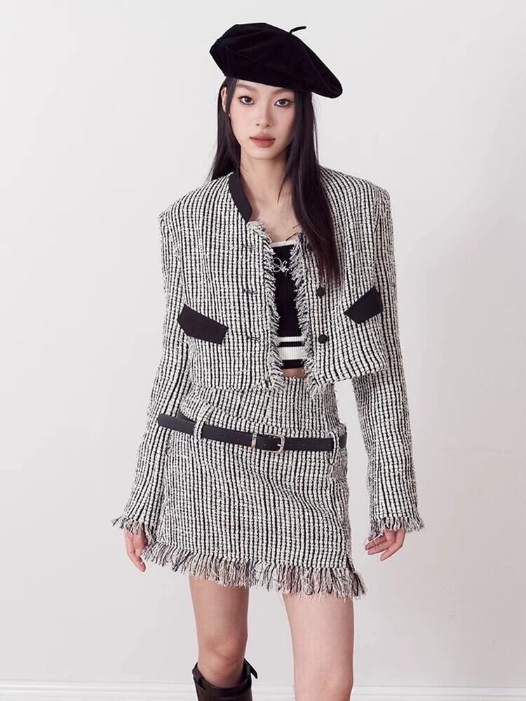 ストリート秋冬スモールフレグランスツイードツーピースセットテルジャケットコート+スカート2点衣装 ウィンター 冬物