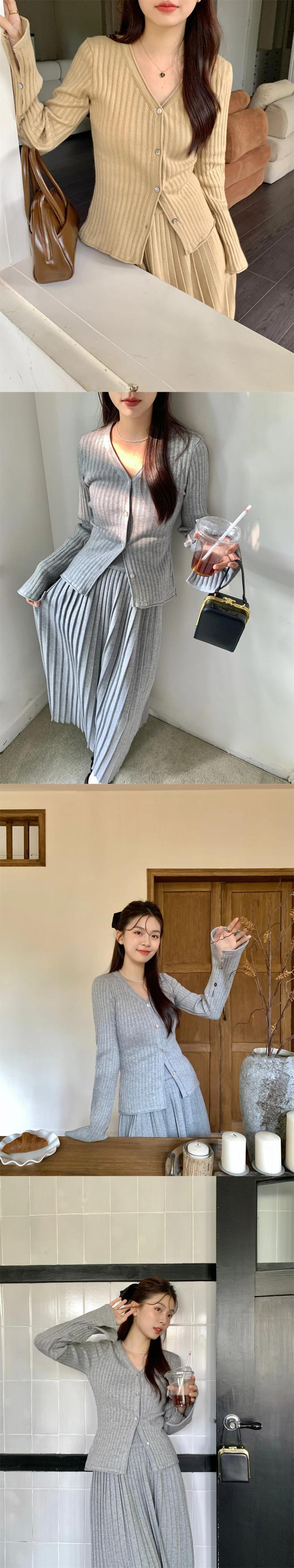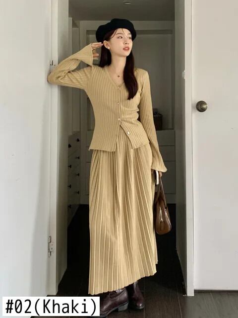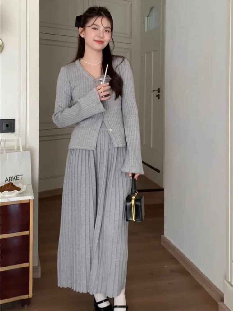 秋冬小さ香りニット 2 点セットカーディガンコート + プリーツロングスカート 2 ピース衣装 オータム 秋物 ウィンター 冬物