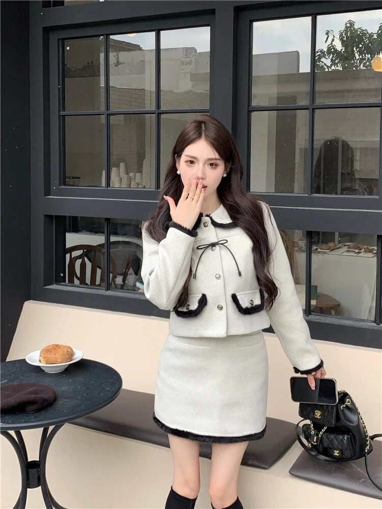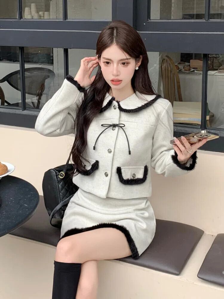 秋冬怠惰スイートウールツーピースセットコート+スカートスーツフレンチスモールフレグランス2点セット 大人ガーリー スウィート キュート カジュアル オータム 秋物 ウィンター 冬物