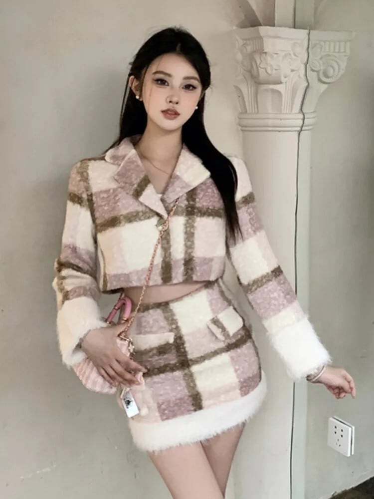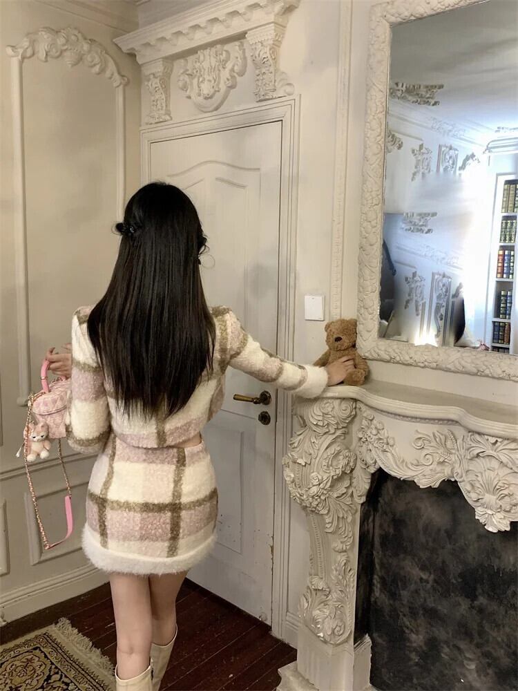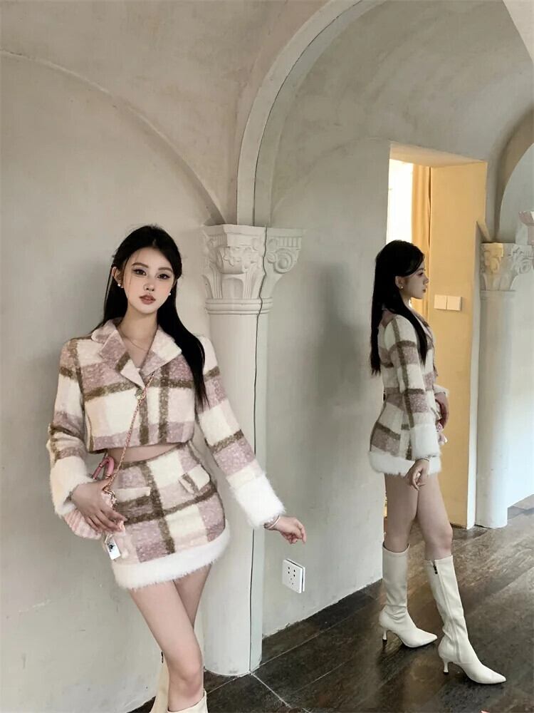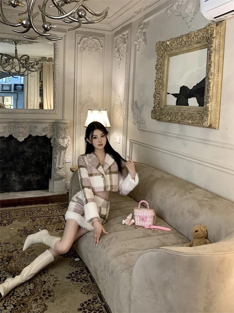 冬甘いチェック柄ジャケットコート + ミニスカート 2 点セット 2 点セットトラックスーツ 大人ガーリー スウィート キュート カジュアル ウィンター 冬物