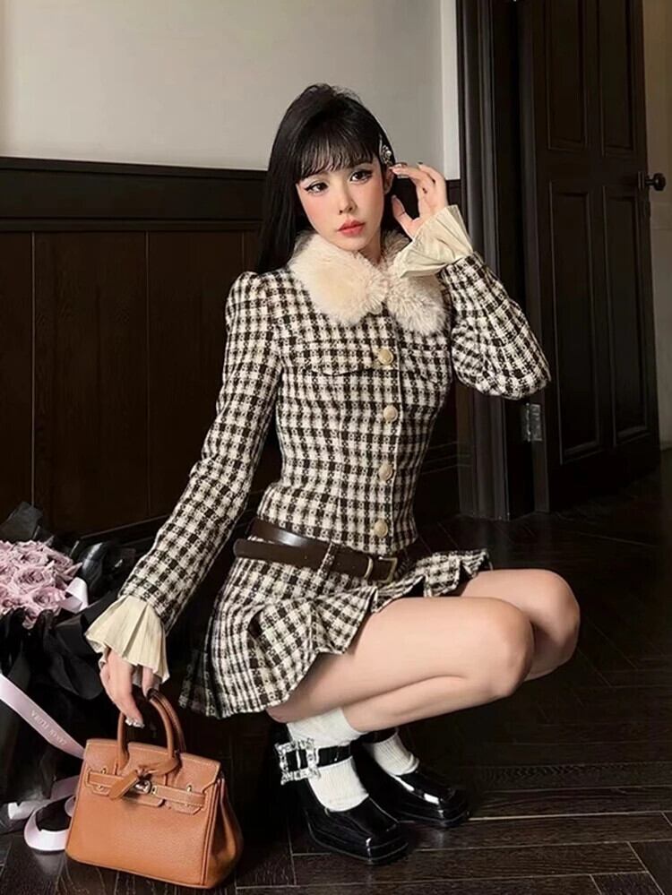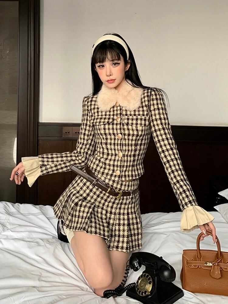 チェック柄ツイード 2 点セットショートジャケットコート + スカートスーツ甘い 2 ピース衣装 大人ガーリー スウィート キュート カジュアル