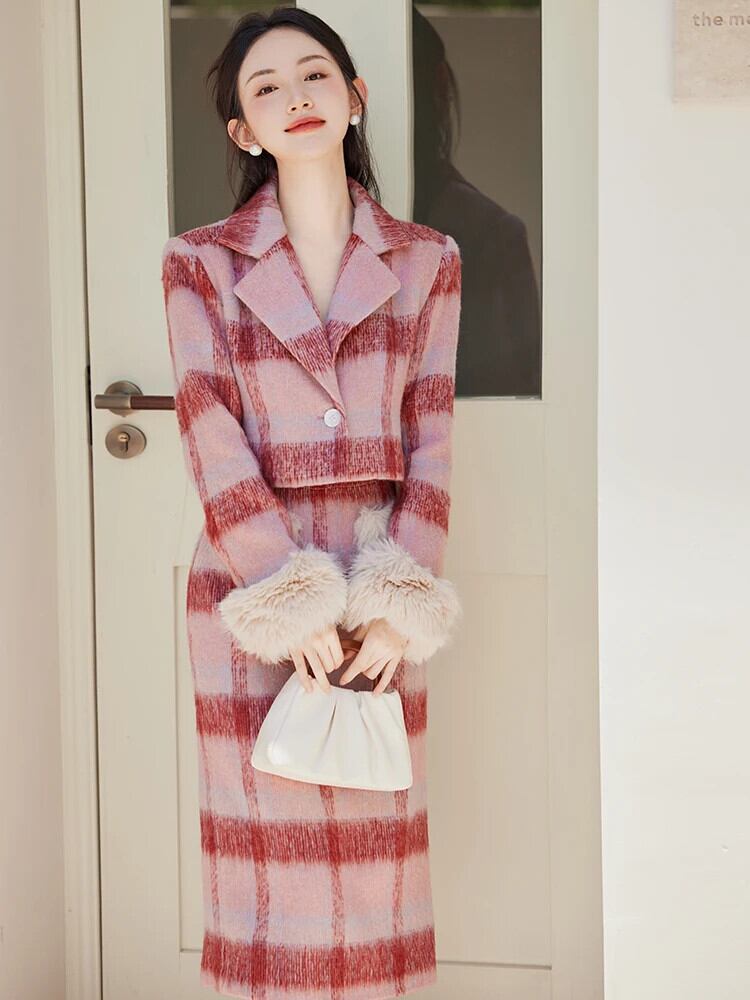 冬厚く暖かい小さ香りツーピースセットショートコート + スカートスーツフレンチ 2 ピース衣装 ウィンター 冬物
