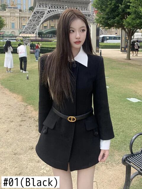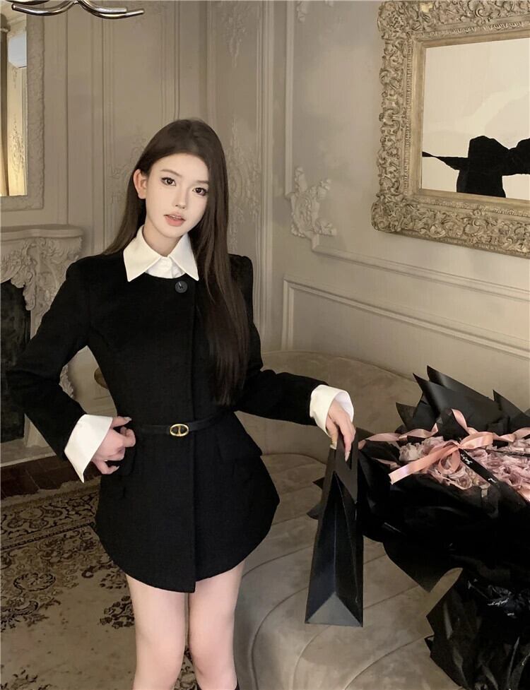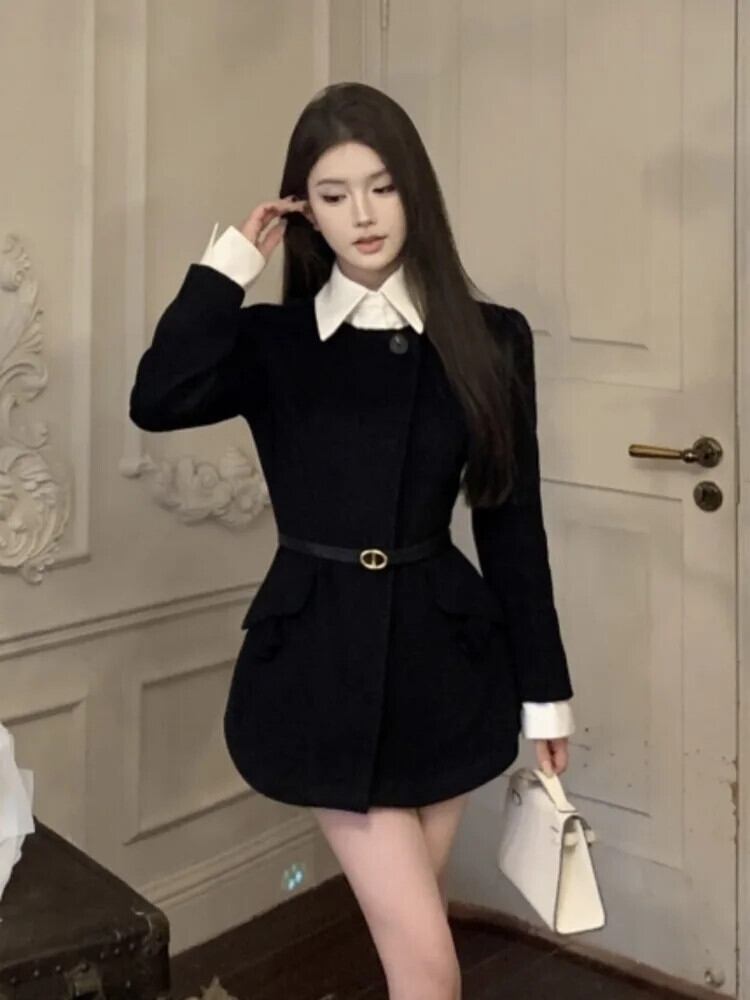 冬肥厚黒フェイクツーピースラペルウールコートレディースロングコートアウターオーバーコート ブラック ウィンター 冬物