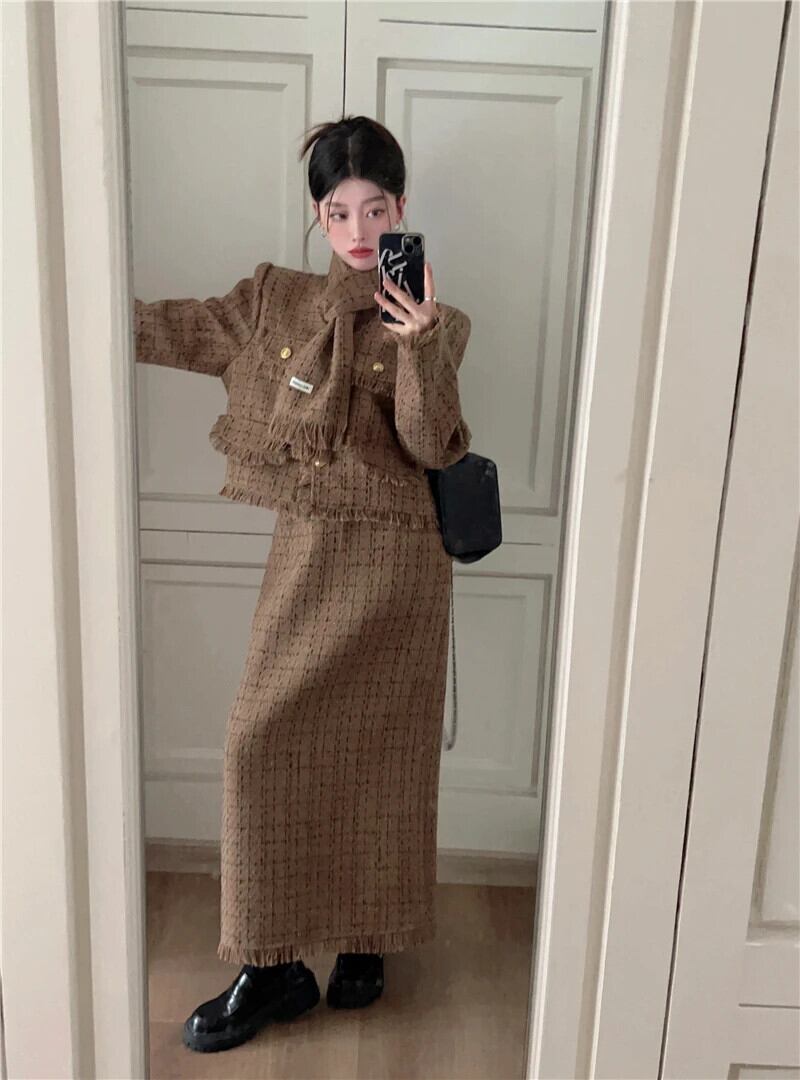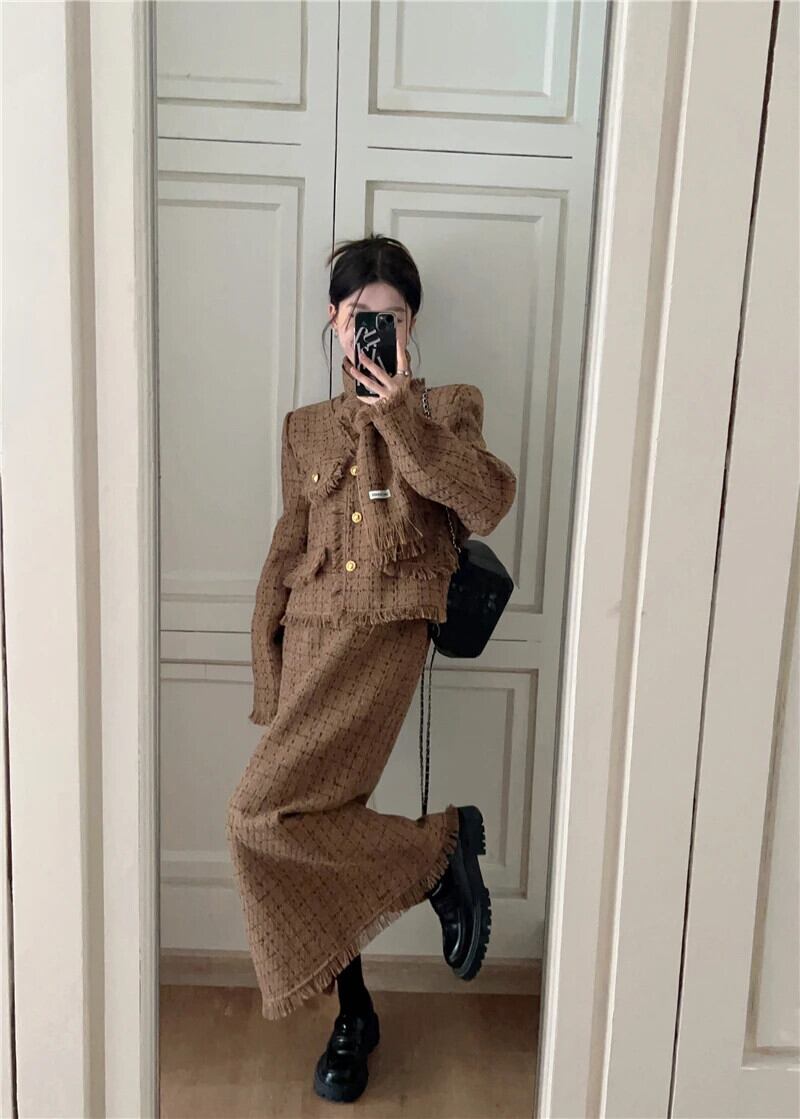 ストリートフレンチスモールフレグランスツーピースセットフリンジジャケットコート+ロングスカートスーツ2点セット