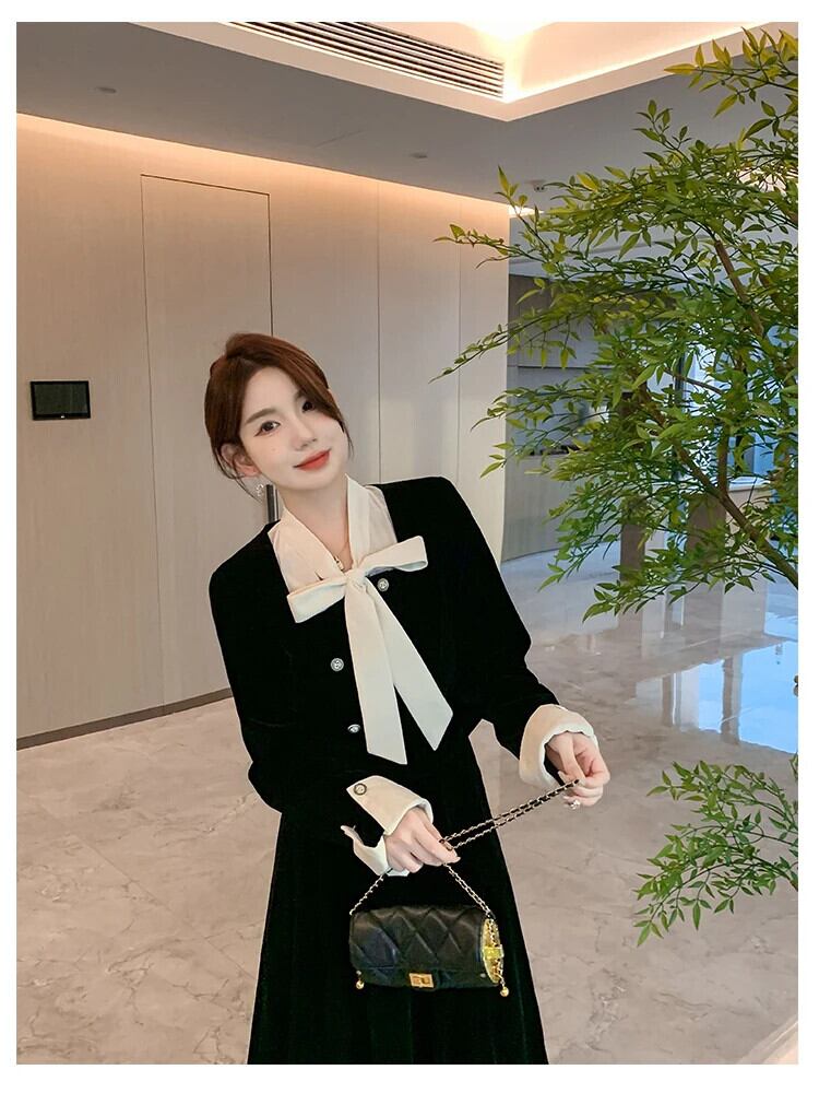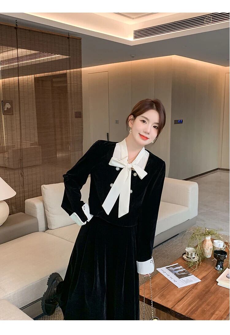 秋冬フレンチスモールフレグランスベルベットツーピースセットボウトップ+ロングスカートセット甘い2ピーススーツ リボン 大人ガーリー スウィート キュート カジュアル オータム 秋物 ウィンター 冬物