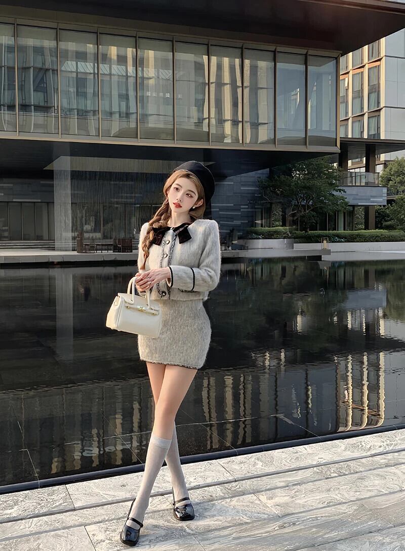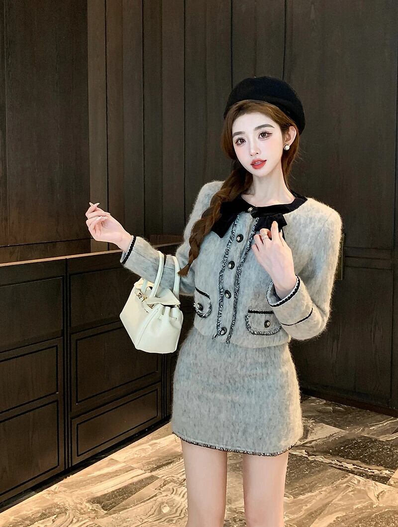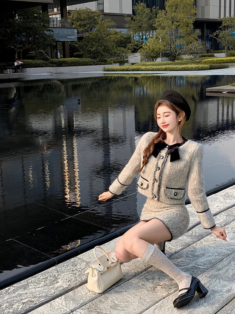 冬スモールフレグランスツーピースセットスウィートジャケットコート+ウエストスカート2ピーススーツ 大人ガーリー キュート カジュアル ウィンター 冬物