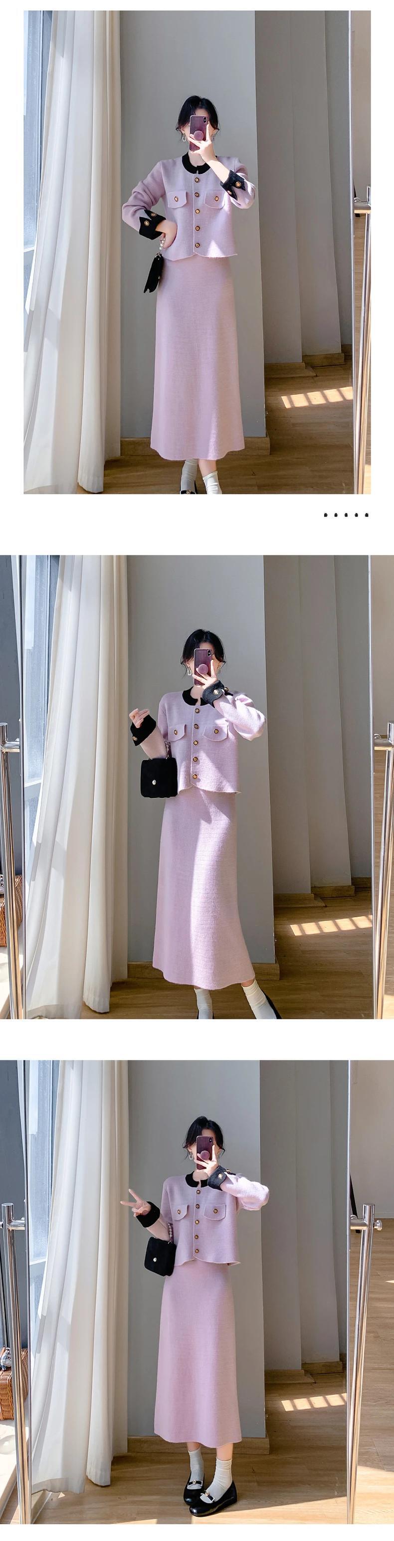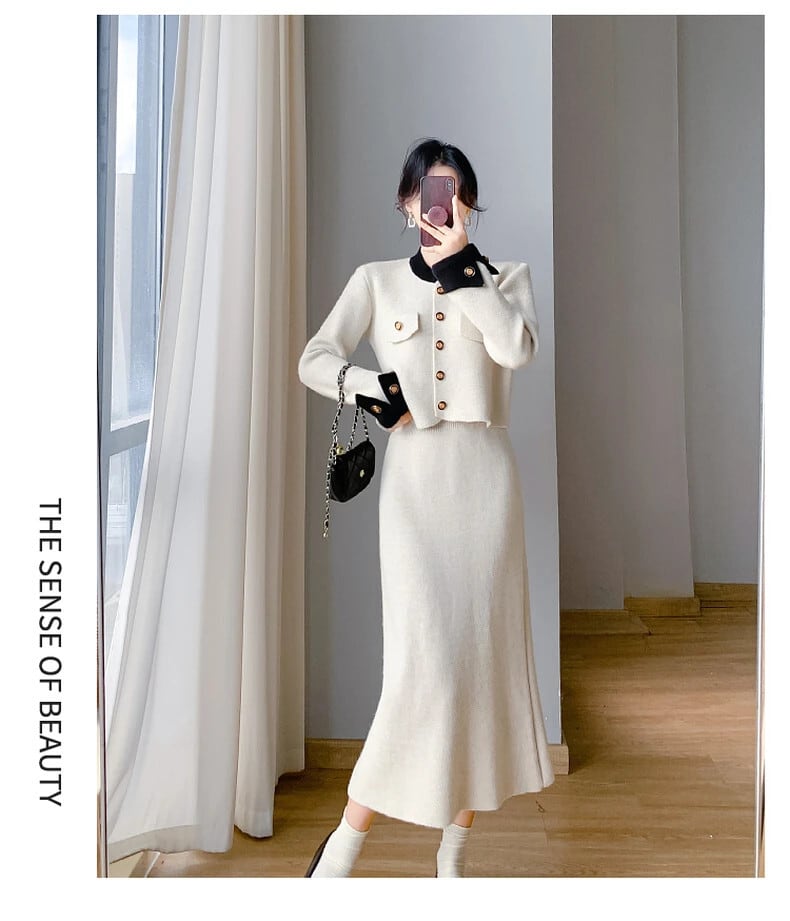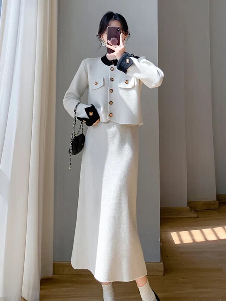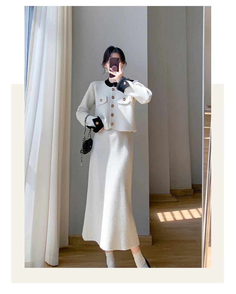 秋冬小さ香りニット 2 点セット甘いカーディガンコート + スプリットロングスカート 2 ピース衣装 大人ガーリー スウィート キュート カジュアル オータム 秋物 ウィンター 冬物