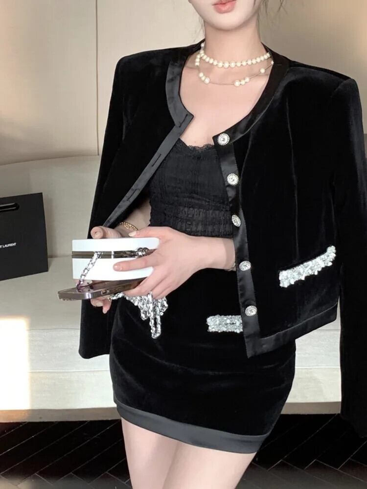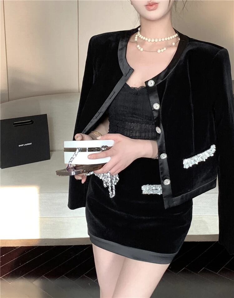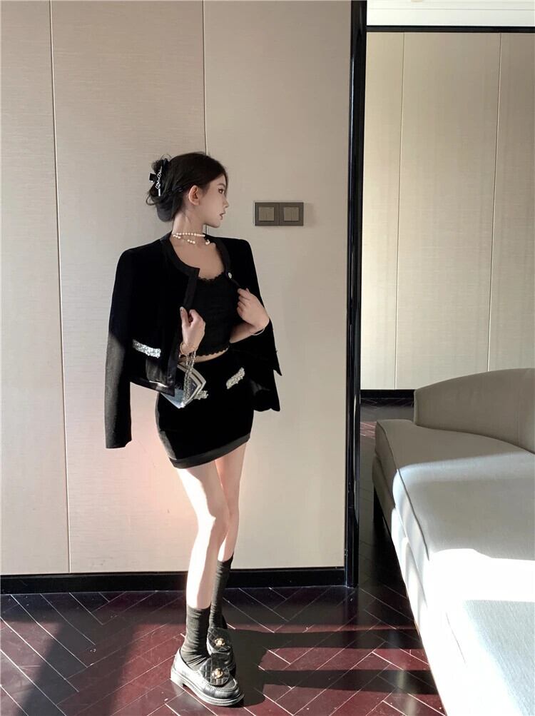 秋冬ベルベット 2 点セットショートジャケットコート + スカートスーツストリート 2 点セット衣装 オータム 秋物 ウィンター 冬物