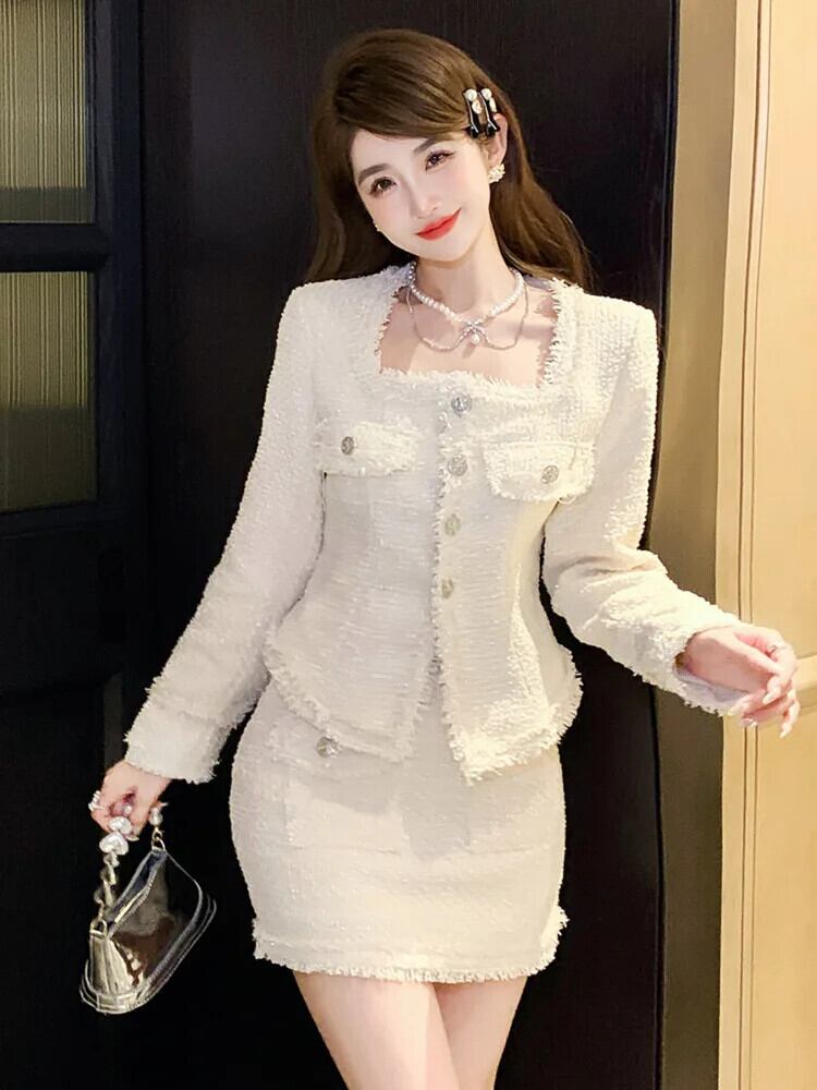 ストリートフレンチスモールフレグランスツイード2点セット衣装甘いジャケットコート+ミニスカート2ピーススーツ 大人ガーリー スウィート キュート カジュアル