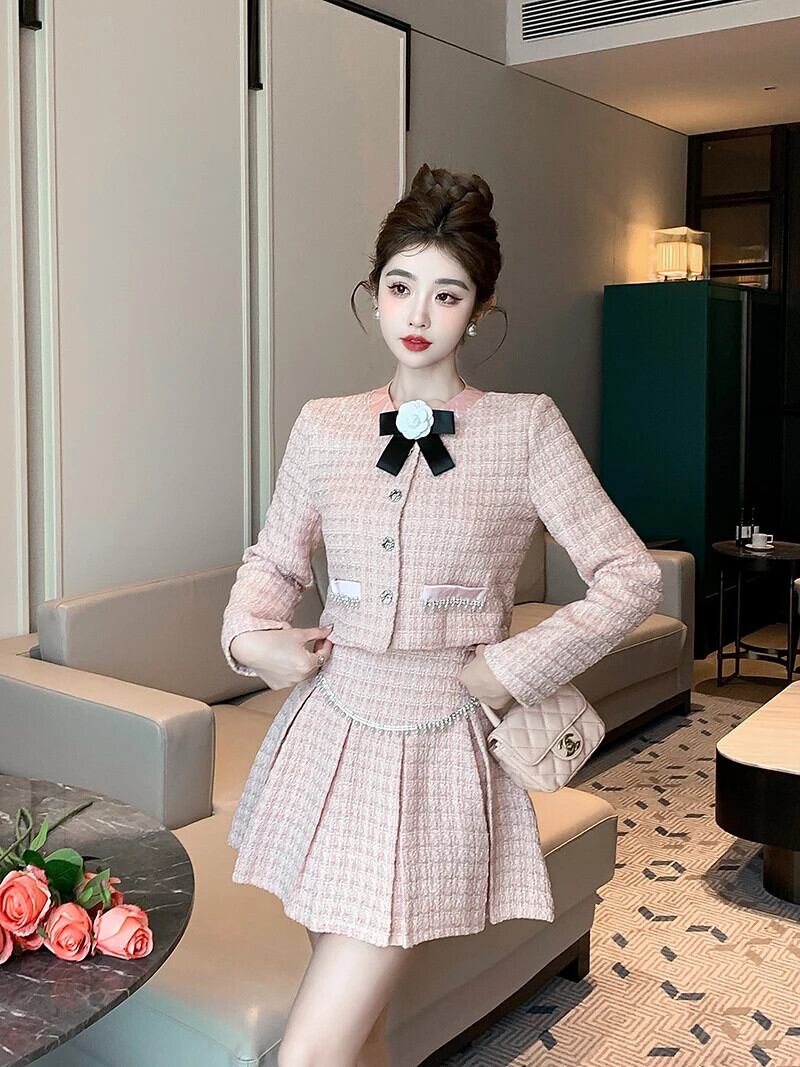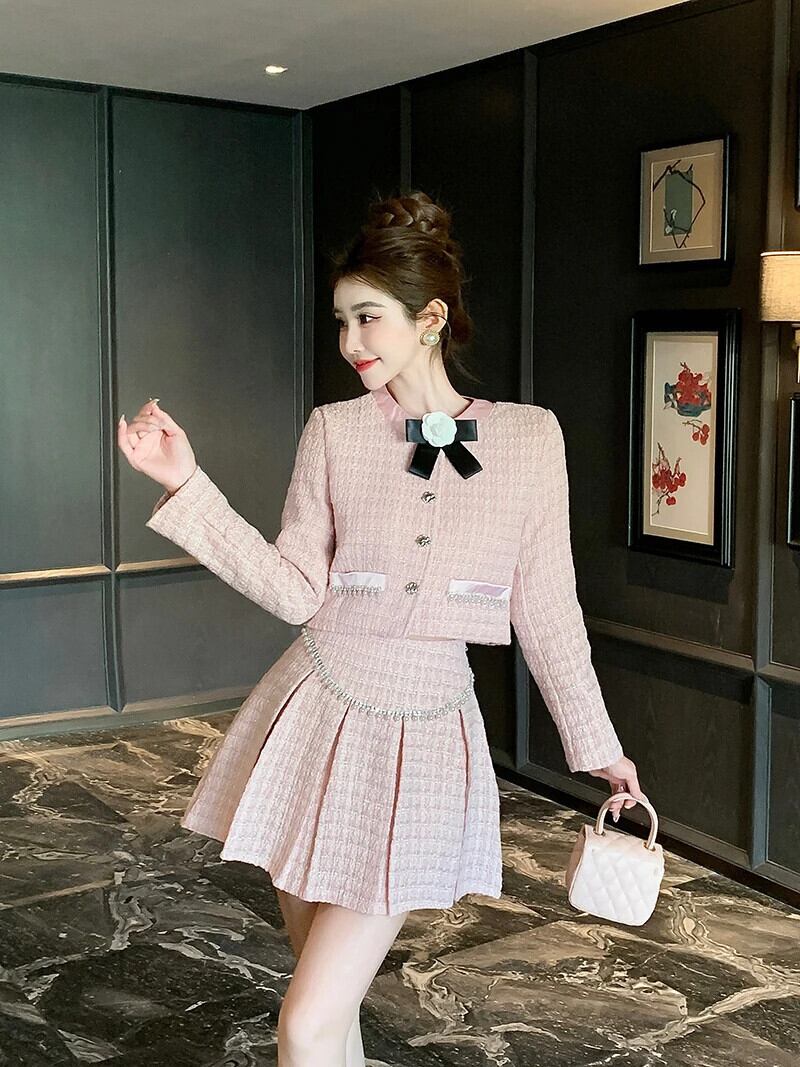 秋冬 2 点セット衣装ボウショートジャケットコート + プリーツスカートスーツマッチングセット リボン オータム 秋物 ウィンター 冬物