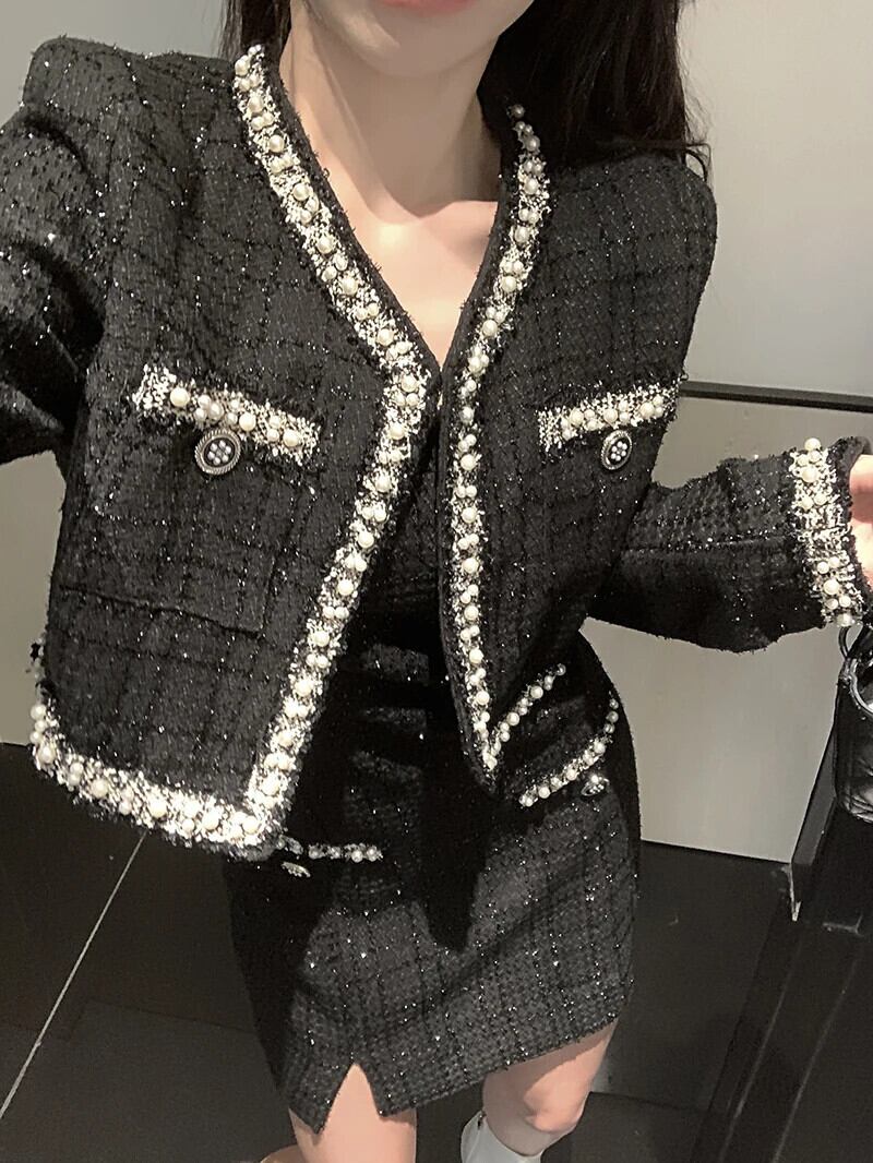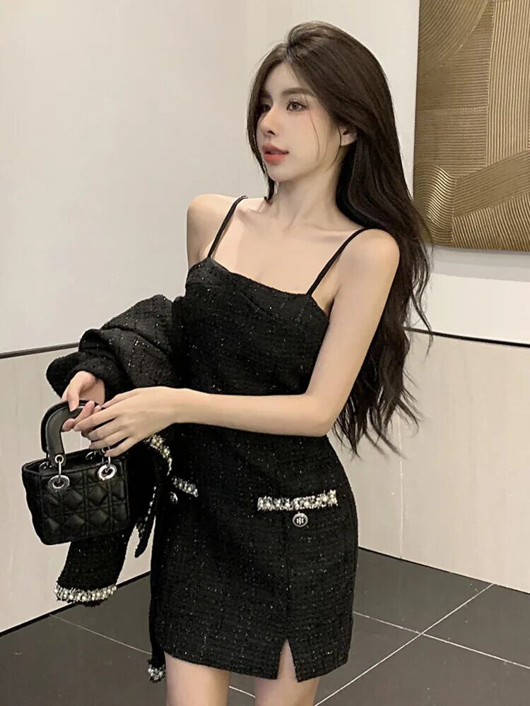秋冬小さフレグランツイード 2 点セットショートジャケットコート + ドレスセット甘い 2 ピース衣装 大人ガーリー スウィート キュート カジュアル オータム 秋物 ウィンター 冬物