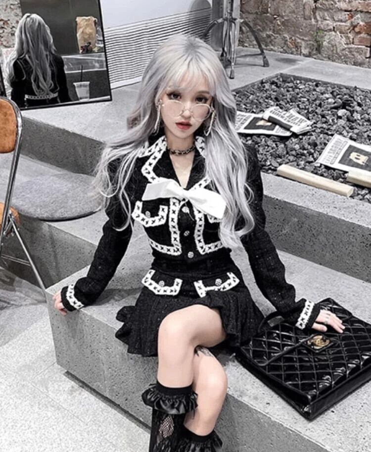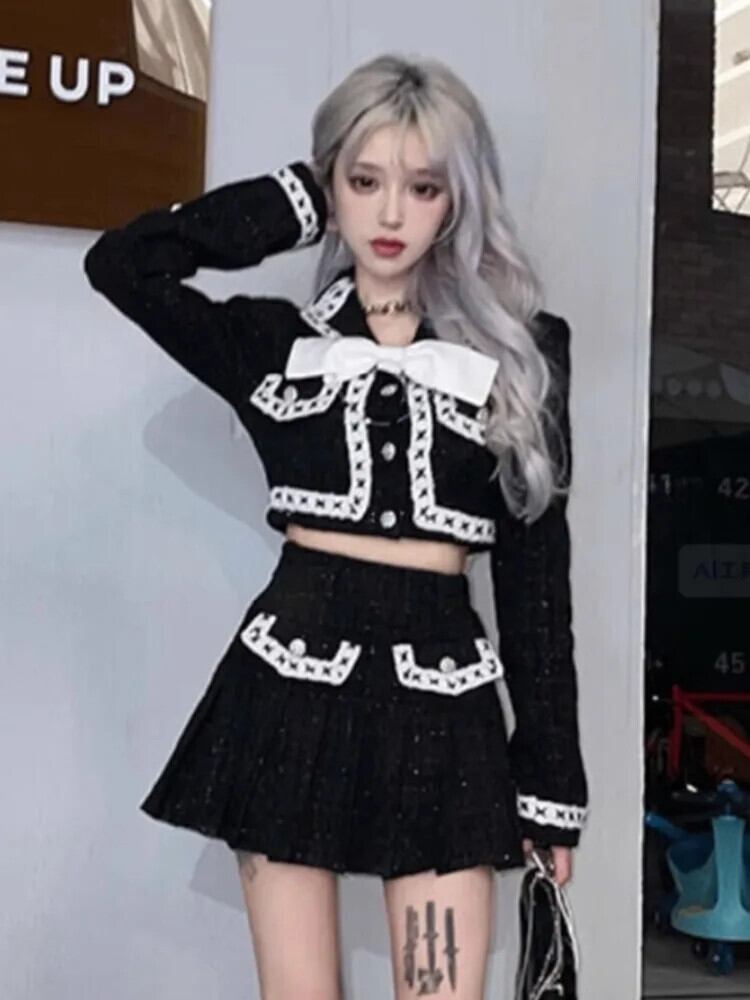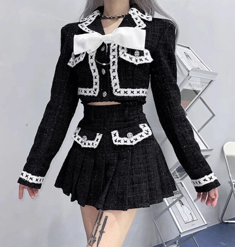 ストリートスモールフレグランスツイードツーピースセットボウジャケットコート+プリーツスカートスーツ2ピース衣装 リボン