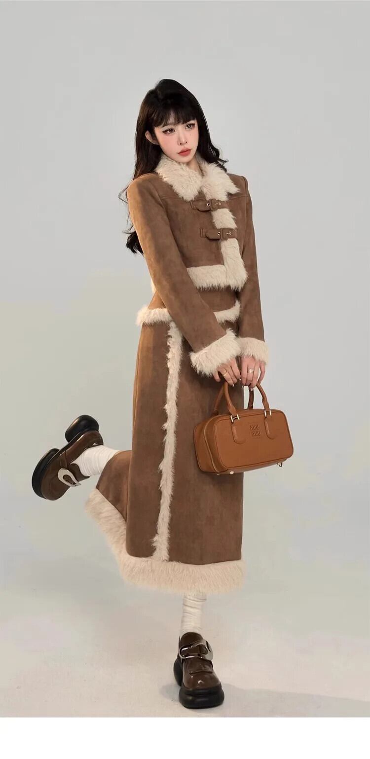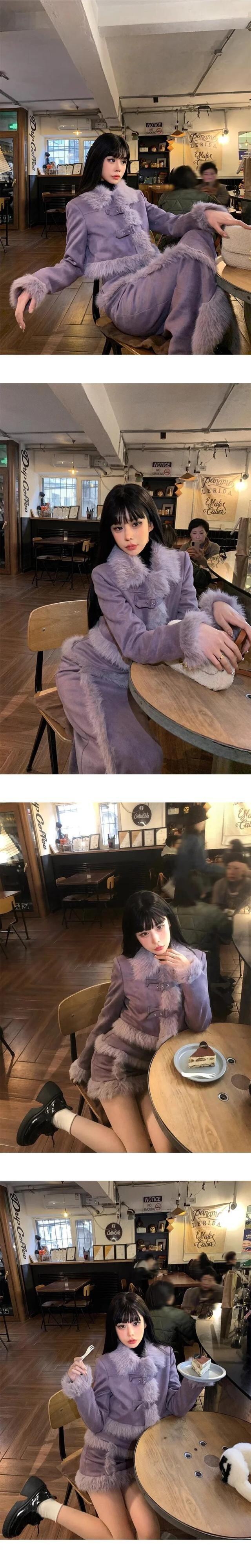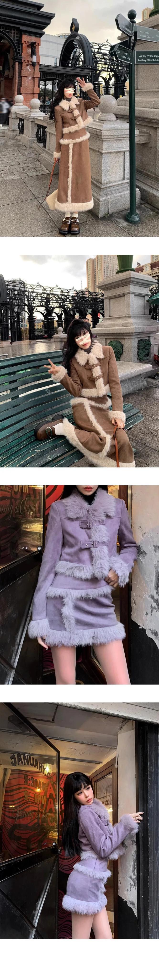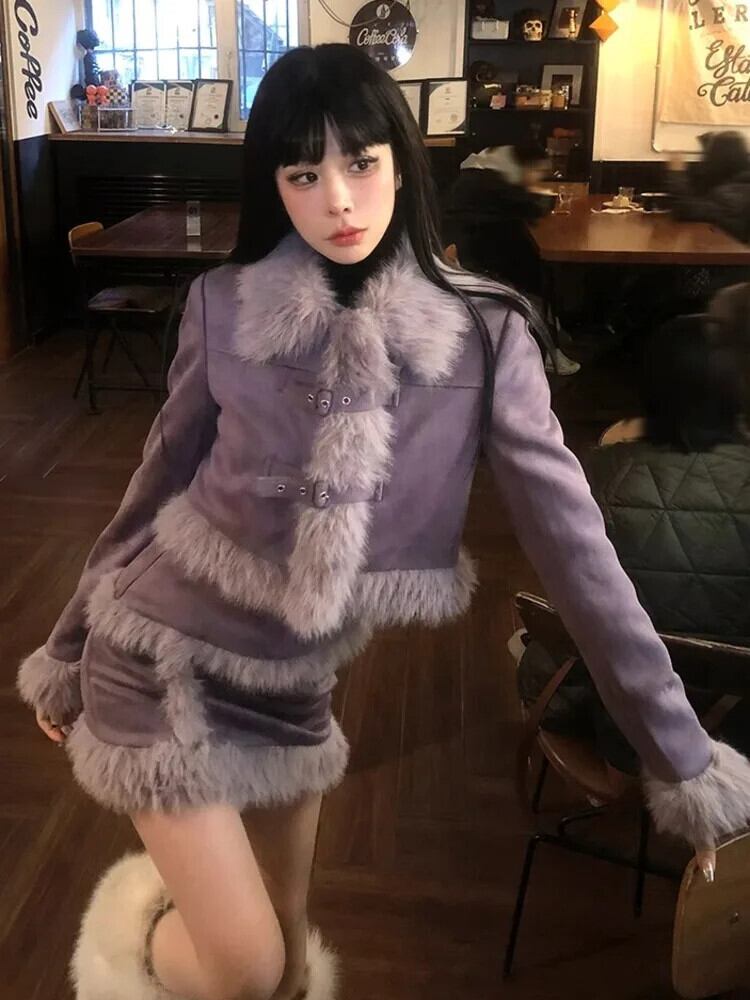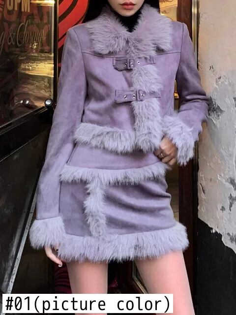 冬厚く暖かいぬいぐるみ 2 点セットショートジャケットコート + スカートセット甘い 2 ピース衣装 大人ガーリー スウィート キュート カジュアル ウィンター 冬物