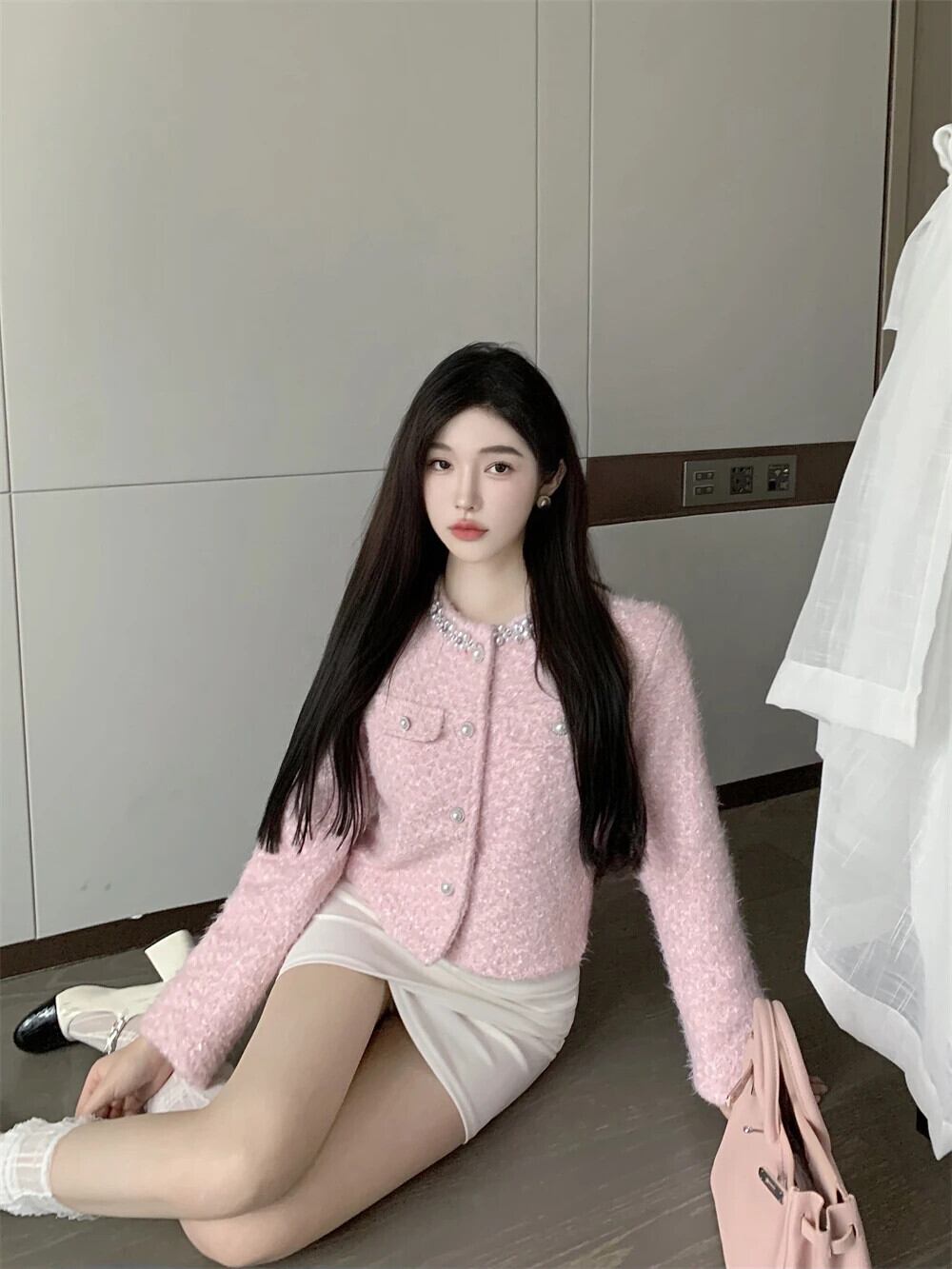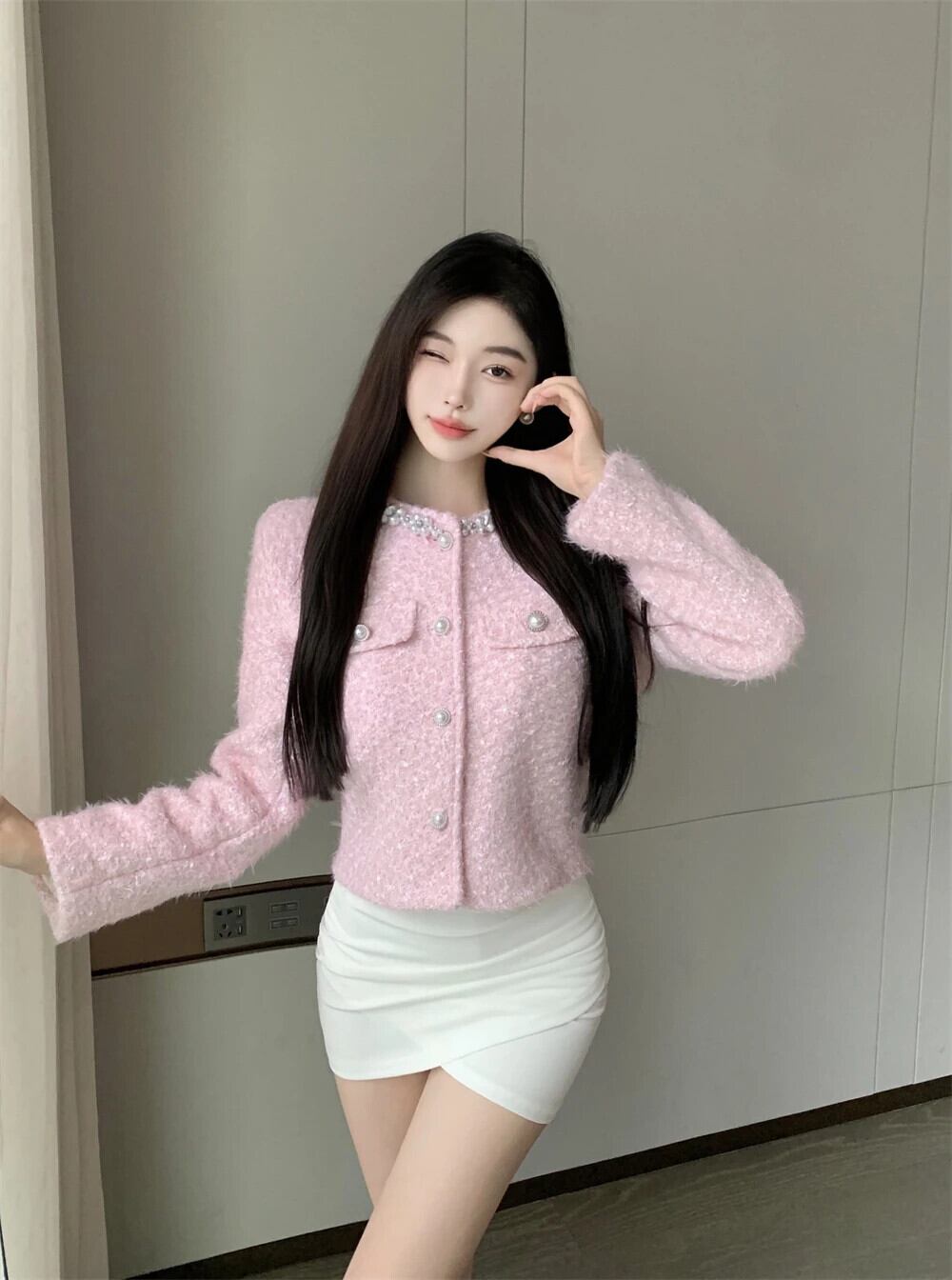 高級ビーズ小さフレグランスツイードジャケットコート秋冬フライドストリートショートコートガール甘いアウター 大人ガーリー スウィート キュート カジュアル オータム 秋物 ウィンター 冬物