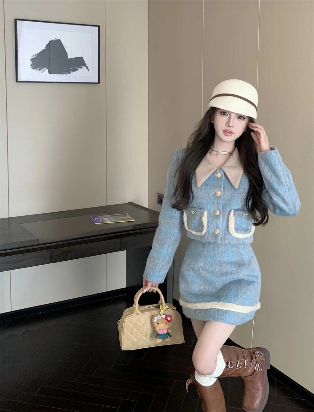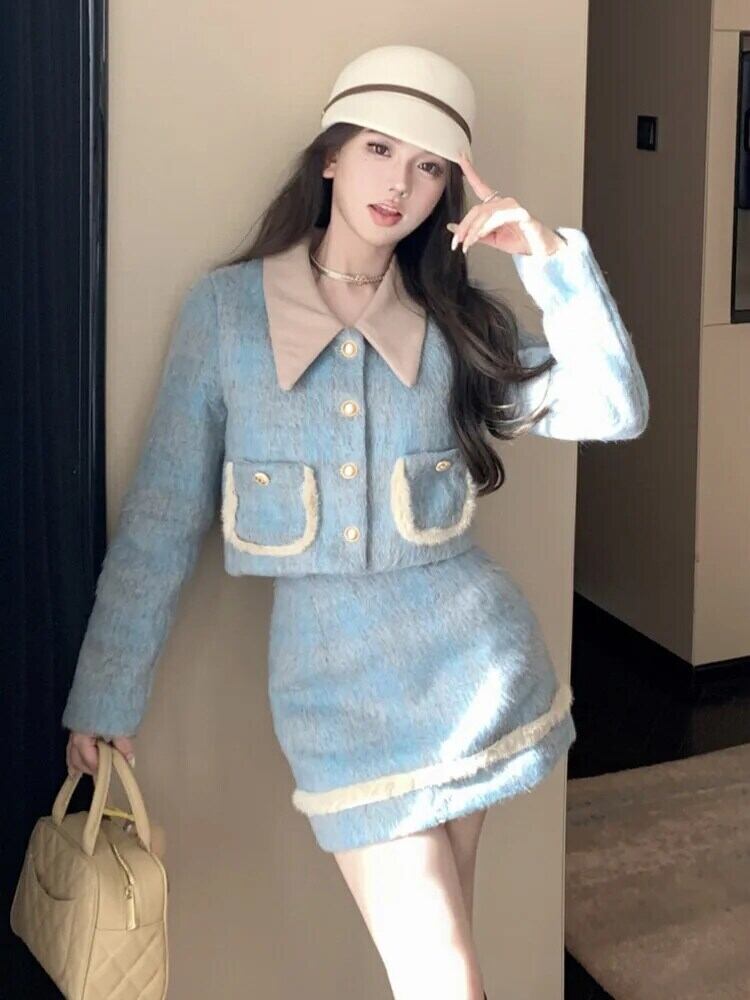 冬豪華小さ香りツーピースセットショートジャケットコート + スカートスーツ甘い 2 ピース衣装 大人ガーリー スウィート キュート カジュアル ウィンター 冬物