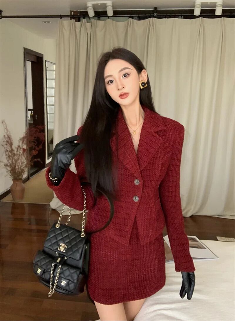 ストリート小さ香りツイード 2 点セットブレザーコート + スカートセット秋冬 2 点セット衣装 ウィンター 冬物