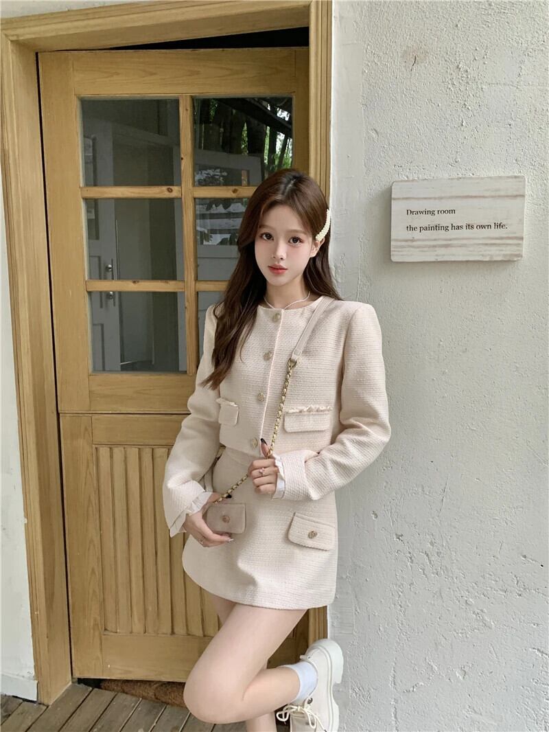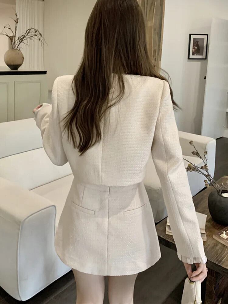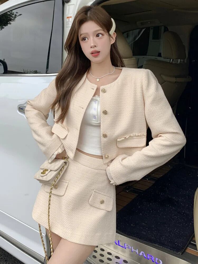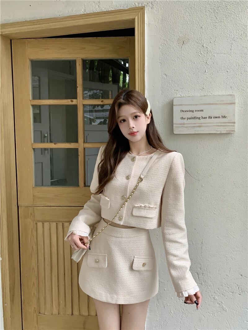 スイートツイード 2 点セットショートジャケットコートクロップトップ + ミニスカートスーツ小さ香り 2 点セット 大人ガーリー スウィート キュート カジュアル