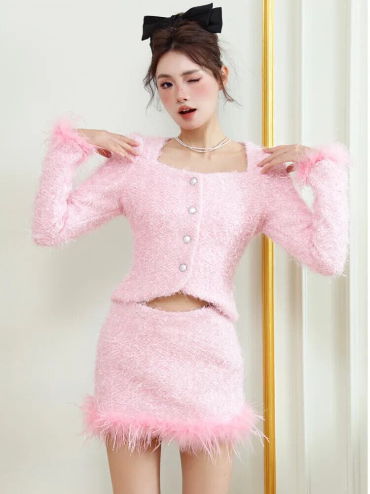秋冬高級ツイード 2 点セットショートジャケットコート + スカートスーツ甘い羽 2 ピース衣装 大人ガーリー スウィート キュート カジュアル オータム 秋物 ウィンター 冬物
