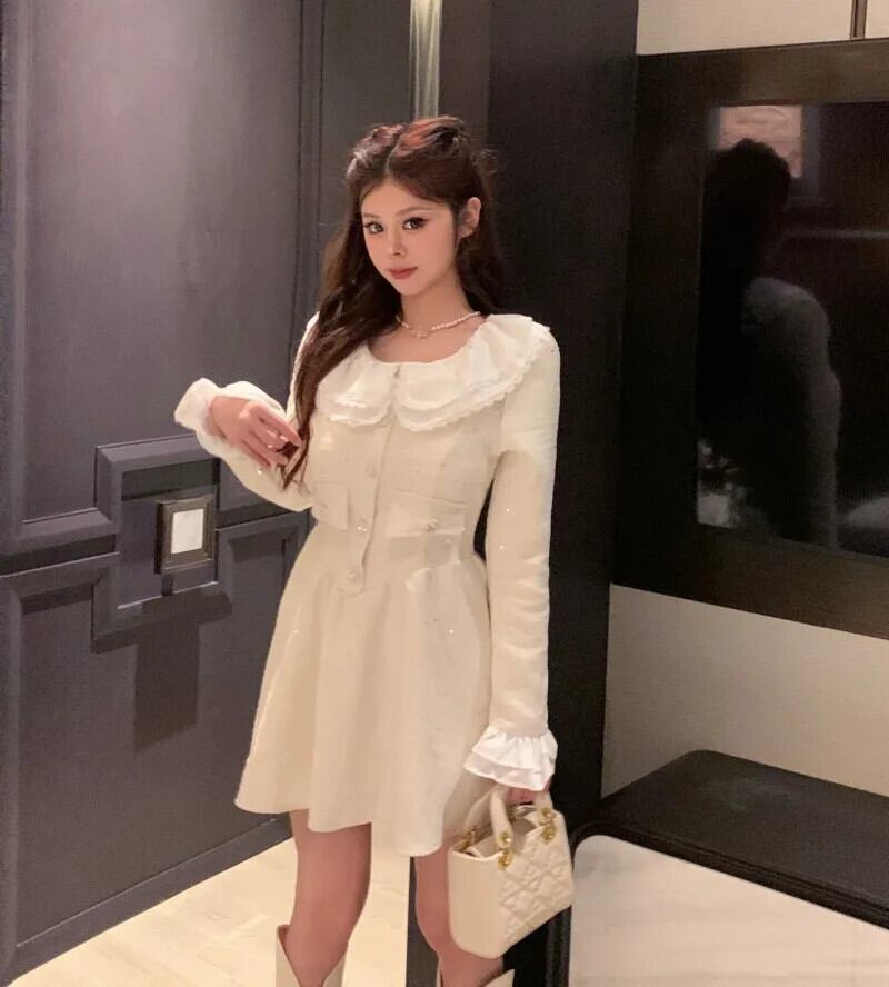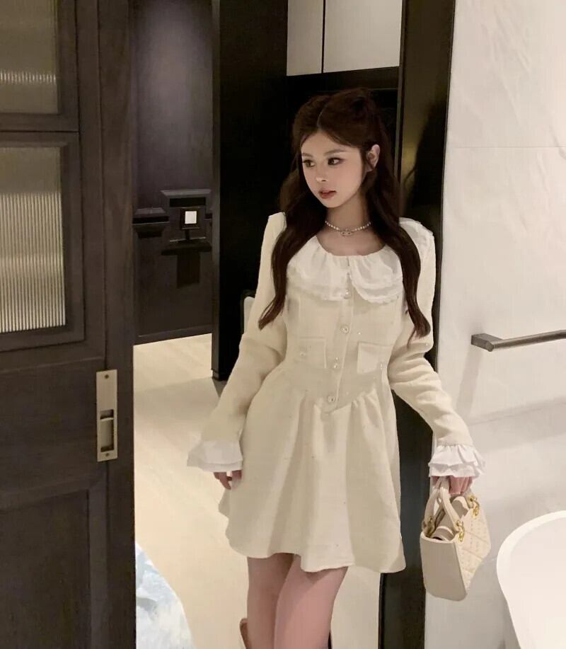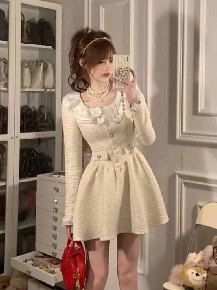 秋冬ガールスイートツイードイブニングドレスミニケーキパーティードレスローブ Vestidos 大人ガーリー スウィート キュート カジュアル オータム 秋物 ウィンター 冬物