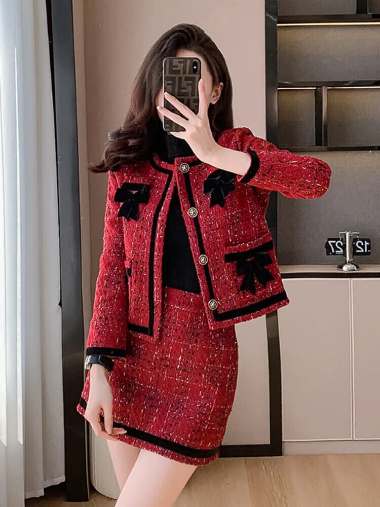甘い小さフレグランスツイード 2 点セットウールジャケットコート + スカート 2 点セット衣装 大人ガーリー スウィート キュート カジュアル