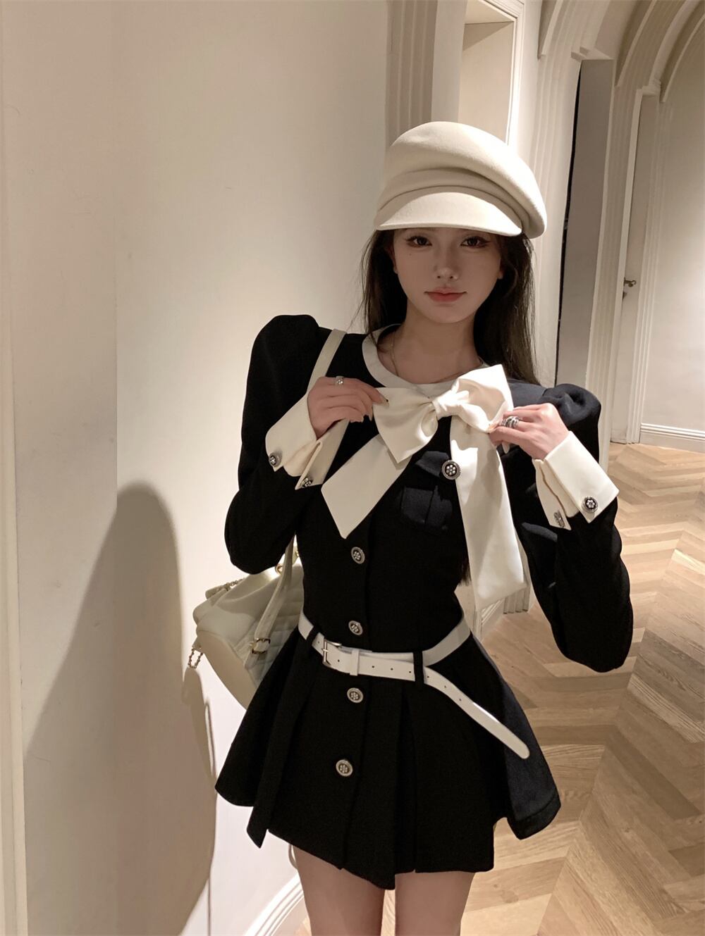 甘いプリーツミニドレス秋長袖スタイルシングルブレストオフィスレディドレス ロング 大人ガーリー スウィート キュート カジュアル オータム 秋物 会社 学校 通勤や通学にも