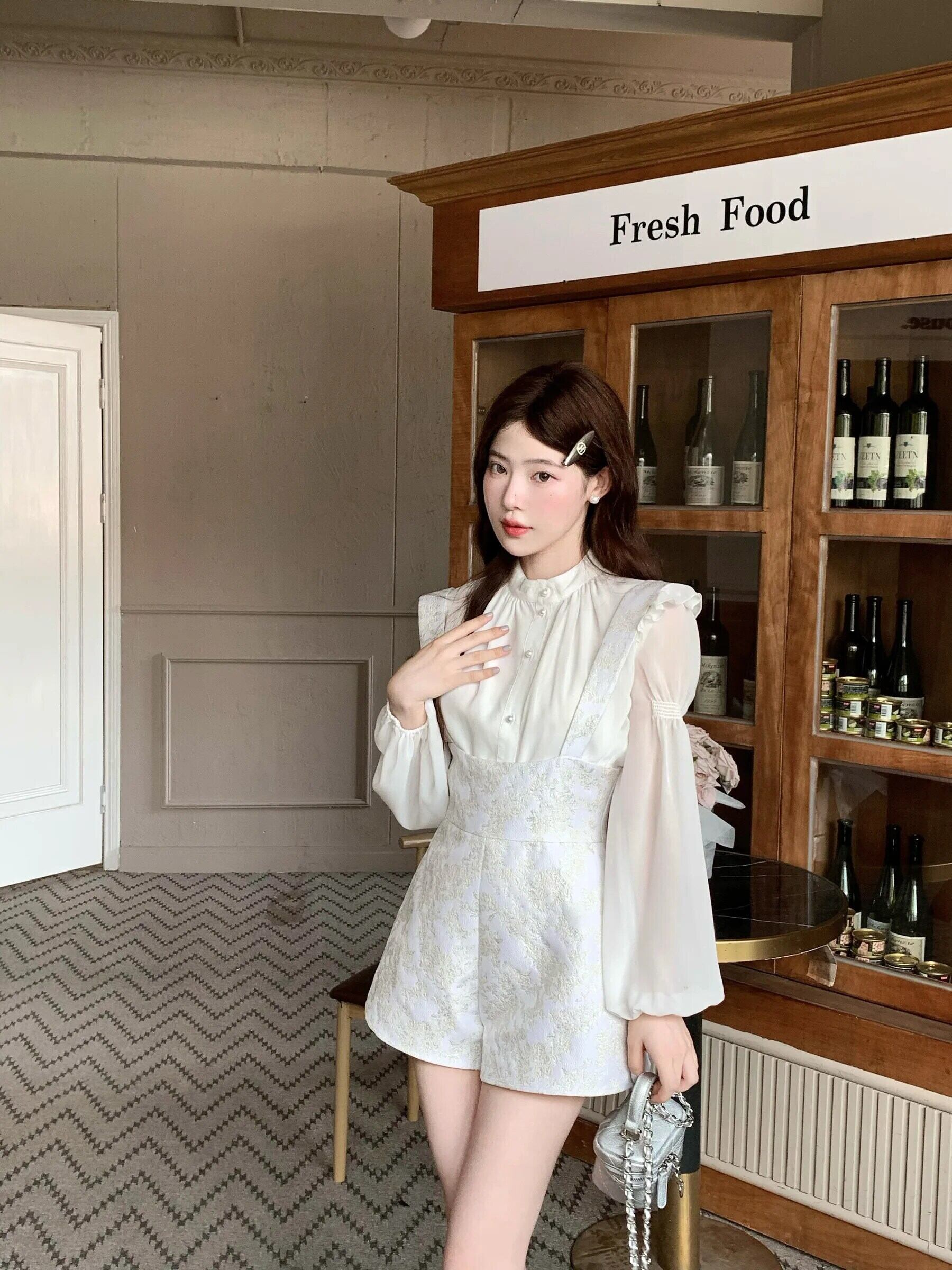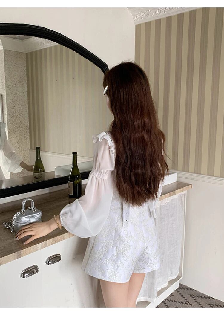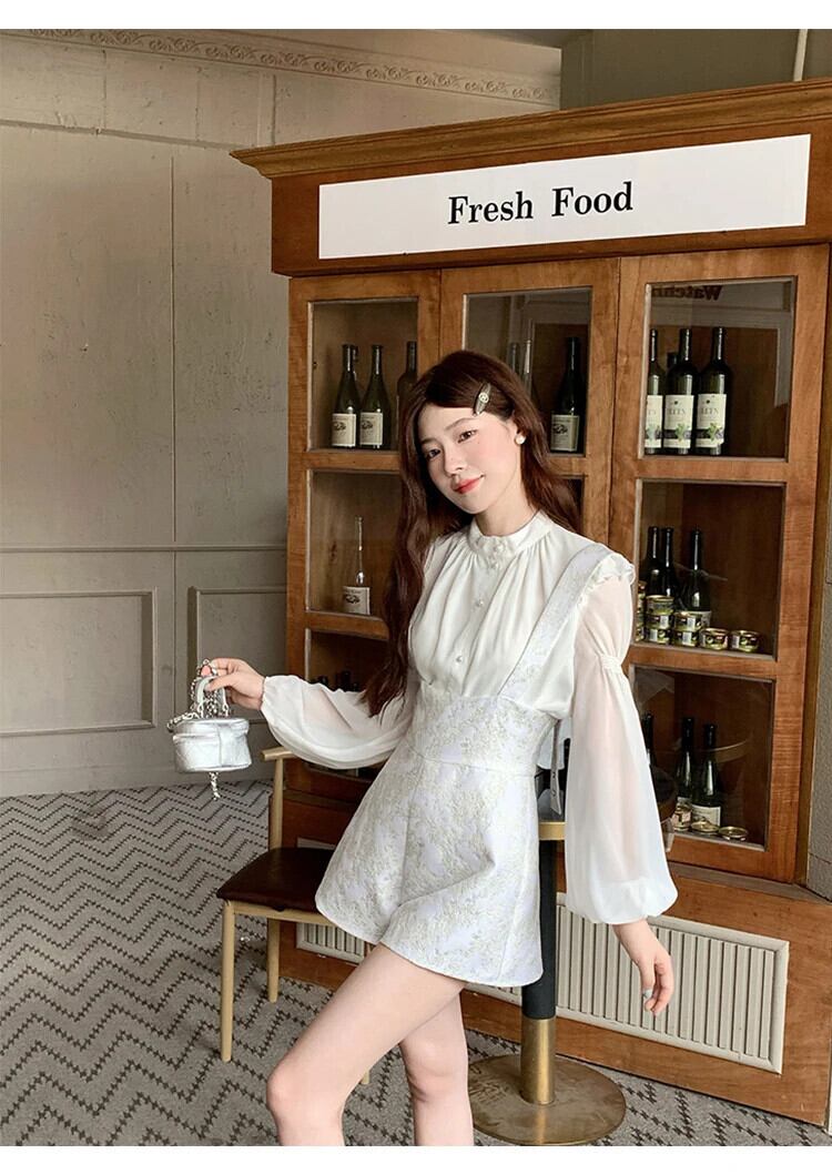 スイート パンツ セット ランタン スリーブ シフォン シャツ トップス + アカード ウエスト ショーツ 2 点セット レディース ランタンスリーブ 大人ガーリー スウィート キュート カジュアル ブルマー