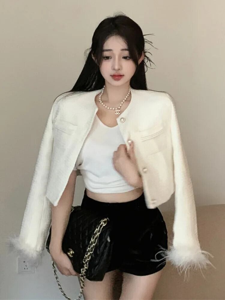 フェザー高級スモールフレグランスツイードジャケットコートショートコート甘いアウタークロップトップ 大人ガーリー スウィート キュート カジュアル