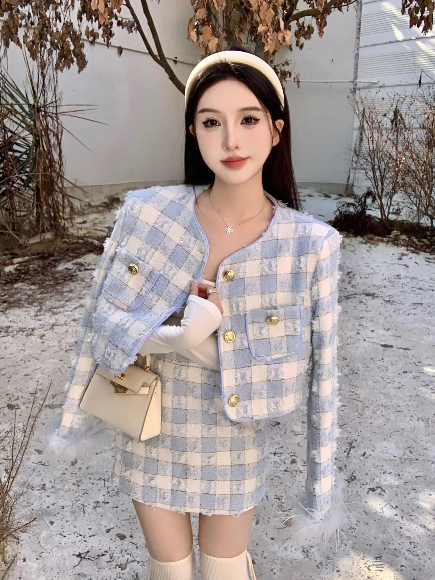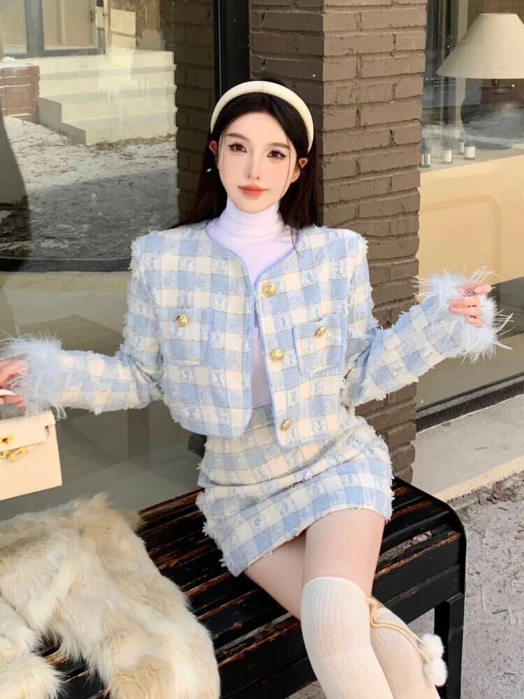秋冬厚いツイード 2 点セットショートジャケットコート + スカートスーツ 2 点セット衣装 オータム 秋物 ウィンター 冬物