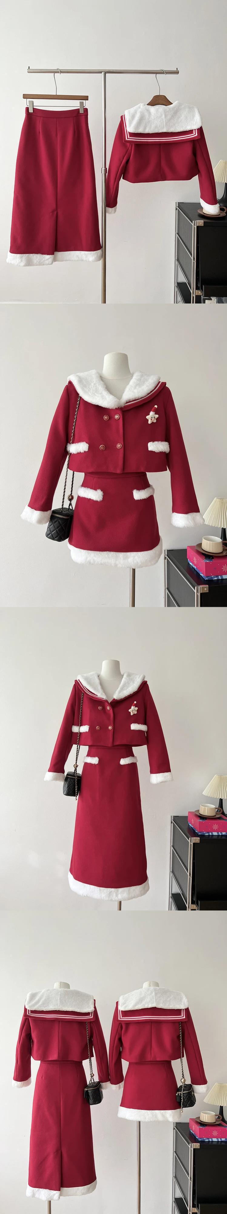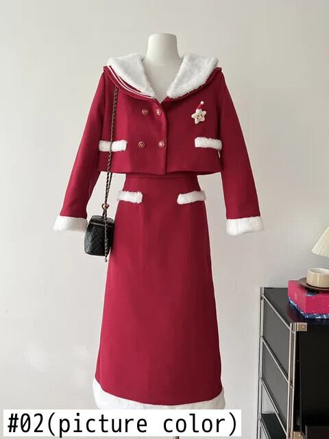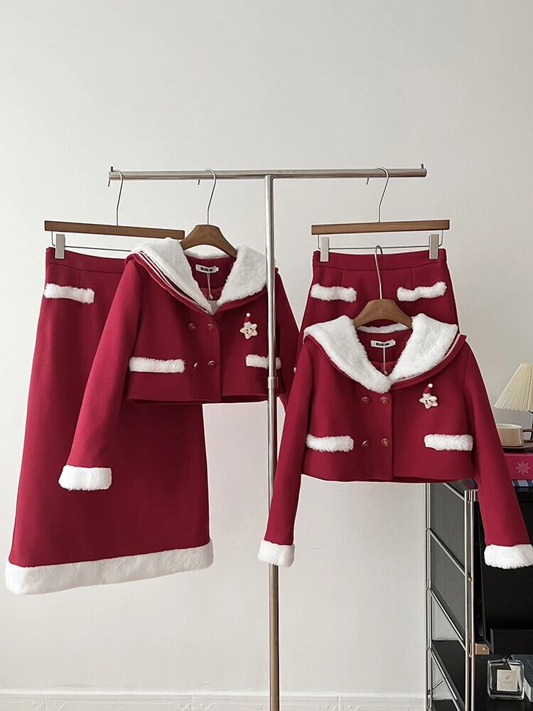 冬クリスマススカート 2 点セットスウィートシックジャケットコート + スカートスーツツーピース衣装 大人ガーリー キュート カジュアル ウィンター 冬物