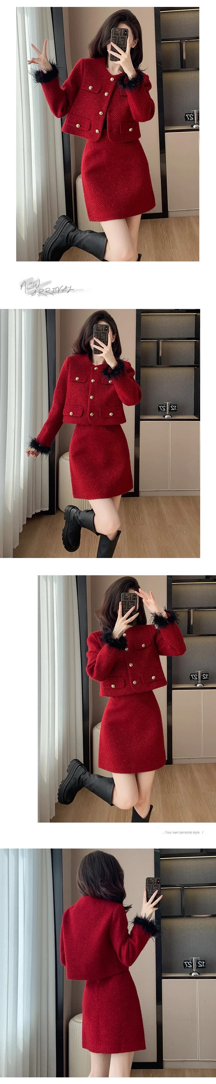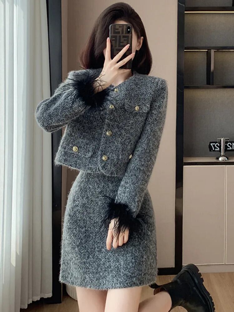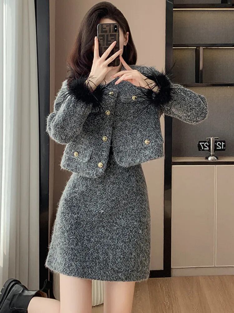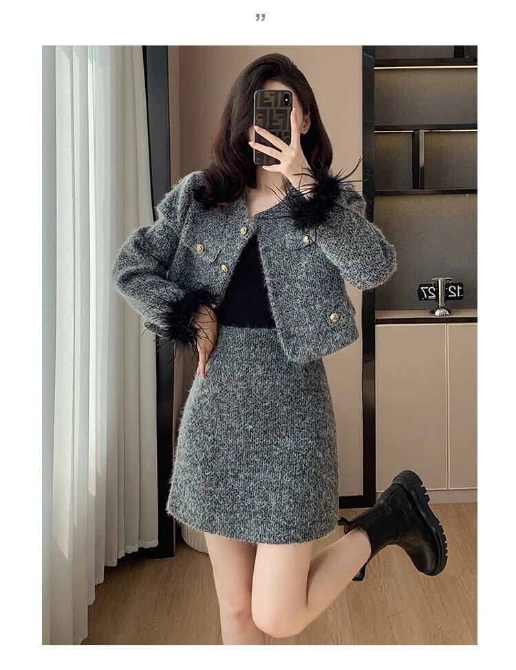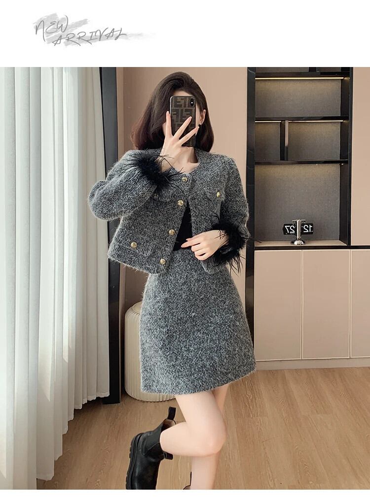 冬ツーピースセットスイートフェザーショートジャケットコート+ミニスカート2ピーススーツ 大人ガーリー スウィート キュート カジュアル ウィンター 冬物