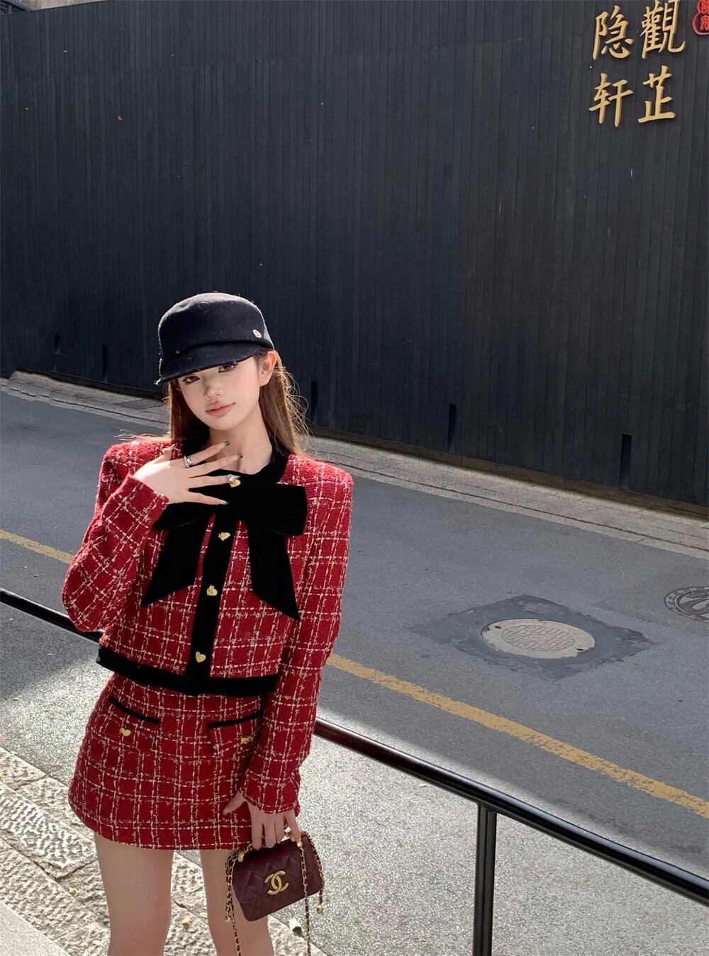 秋冬 2 点セットシングルブレストショートコート + スカートセットツイード甘い衣装スーツ 大人ガーリー スウィート キュート カジュアル オータム 秋物 ウィンター 冬物