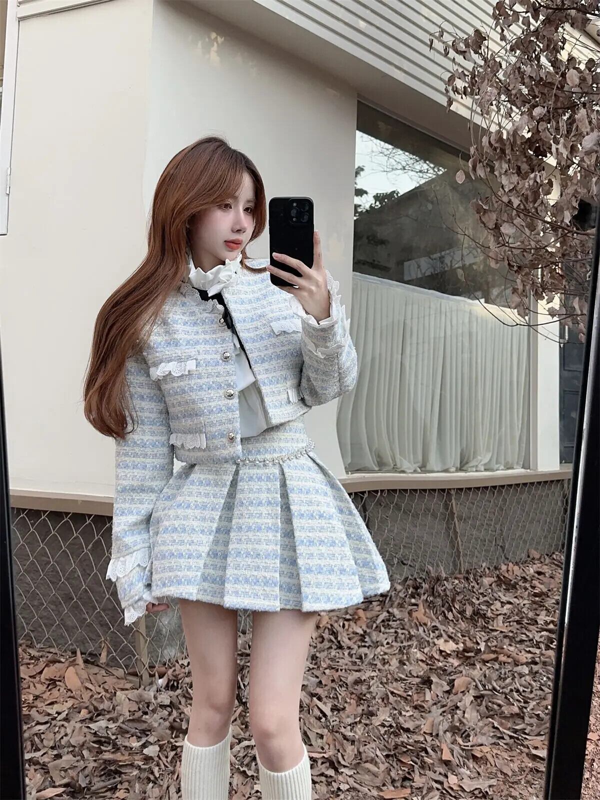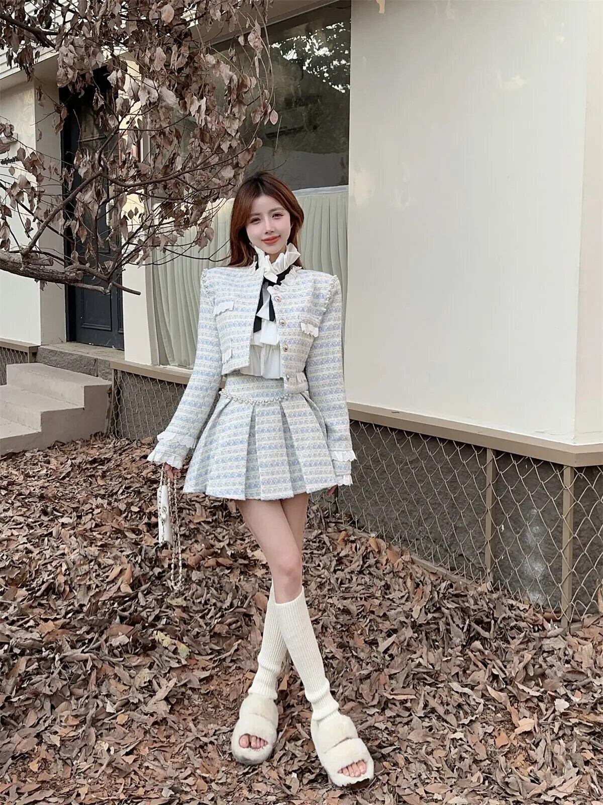 秋冬小さフレグランツイード 2 点セット甘いビーズウールジャケット + プリーツスカートスーツ衣装 大人ガーリー スウィート キュート カジュアル オータム 秋物 ウィンター 冬物