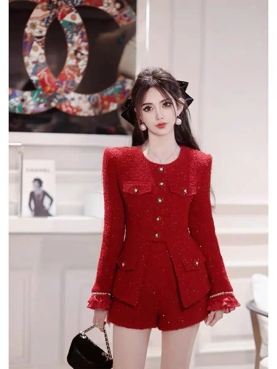 ストリートスモールフレグランスツーピースパンツセットジャケットコート+ショートセットガールスイート2ピースパンツスーツ 大人ガーリー スウィート キュート カジュアル