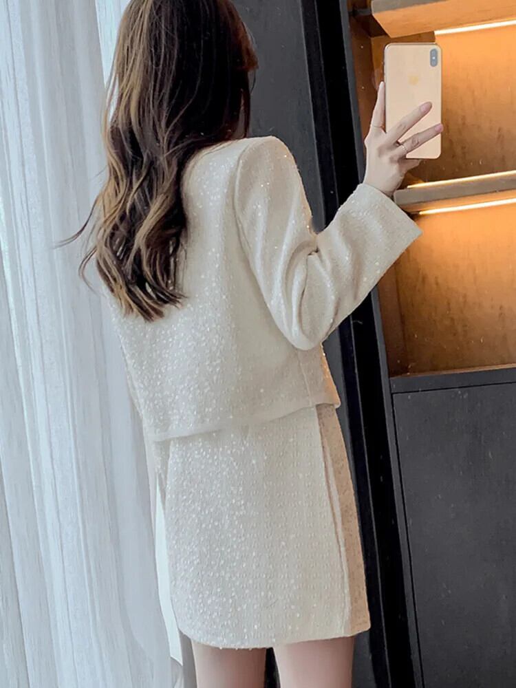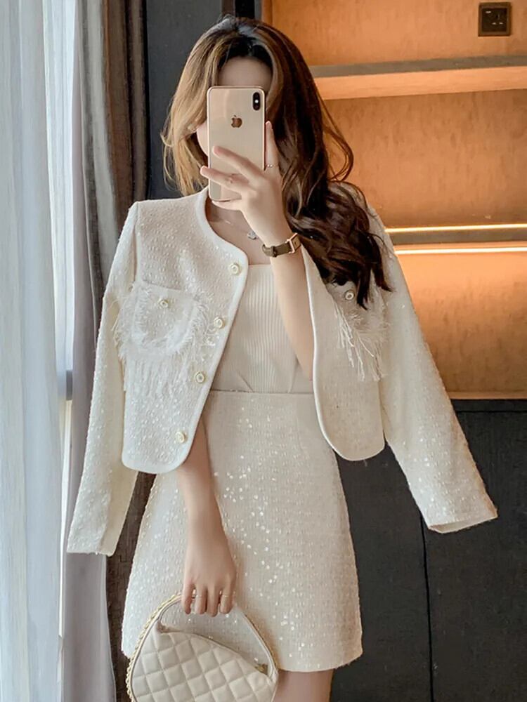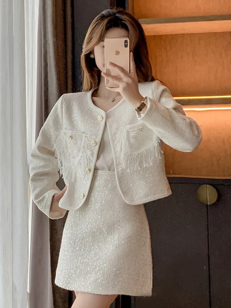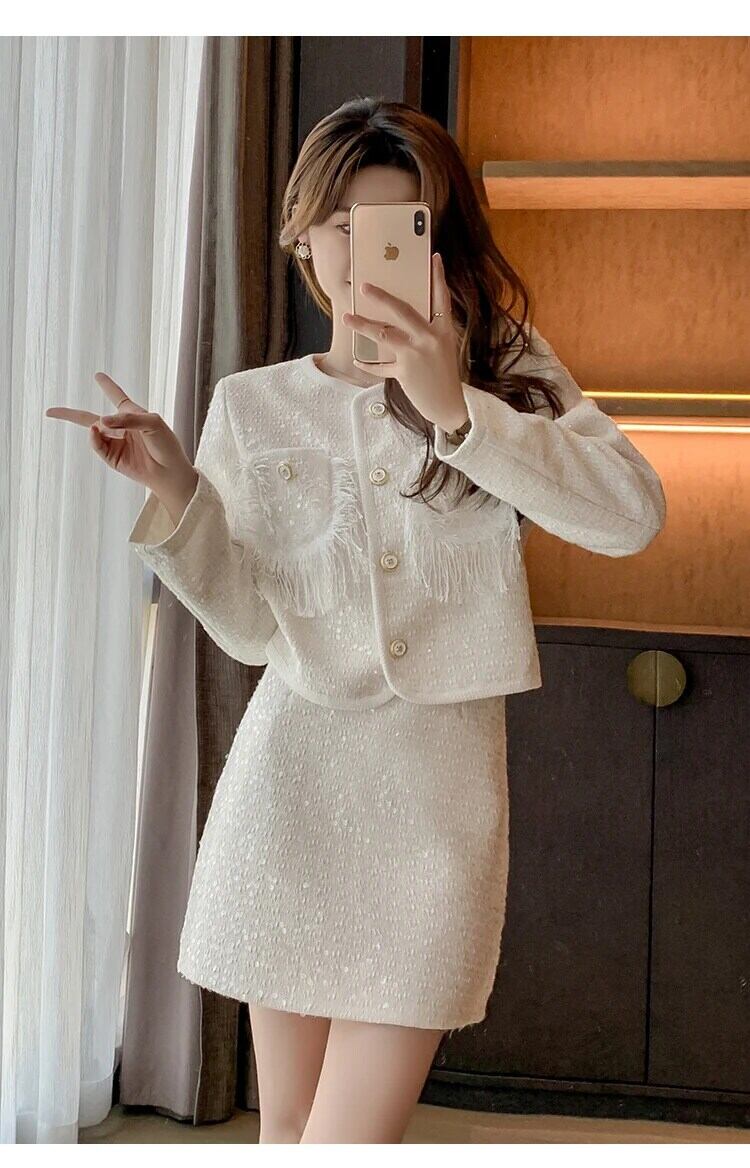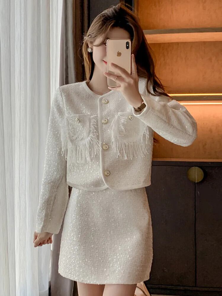 秋冬高級小さフレグランツイード 2 点セット電話ショートジャケットコート + ミニスカートスーツ甘い 2 ピース衣装 大人ガーリー スウィート キュート カジュアル オータム 秋物 ウィンター 冬物