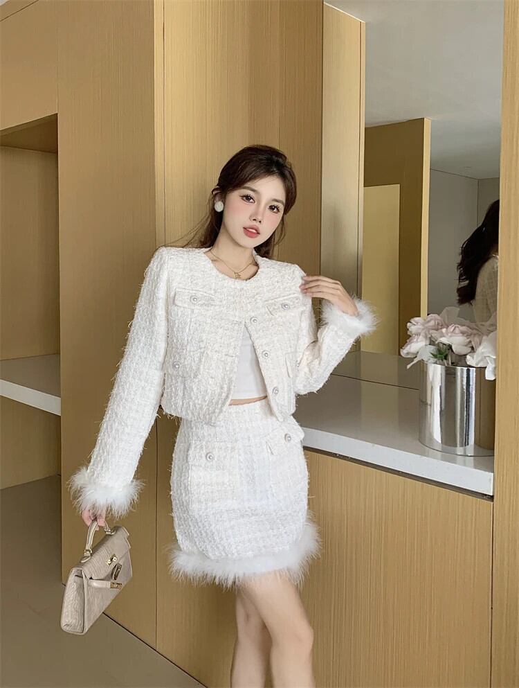 ストリートラグジュアリースモールフレグランスツーピースセットショートジャケットコート+スカートスーツウィンタースイート2ピースセット 大人ガーリー スウィート キュート カジュアル 冬物