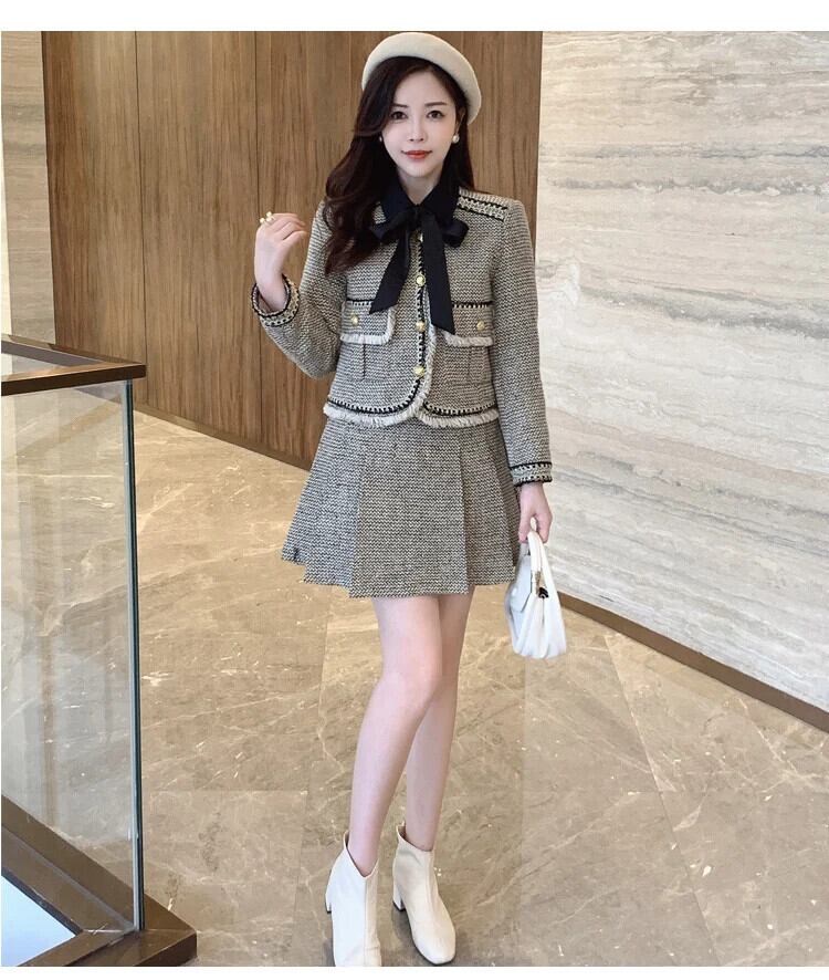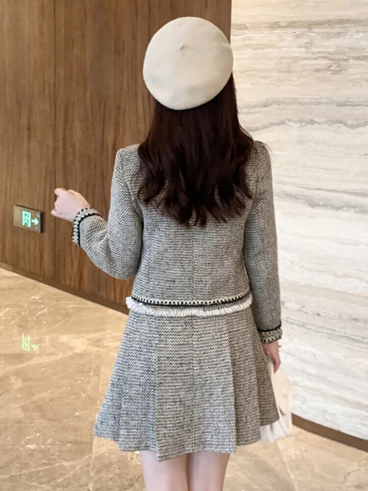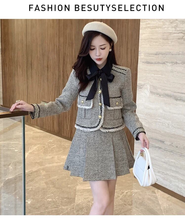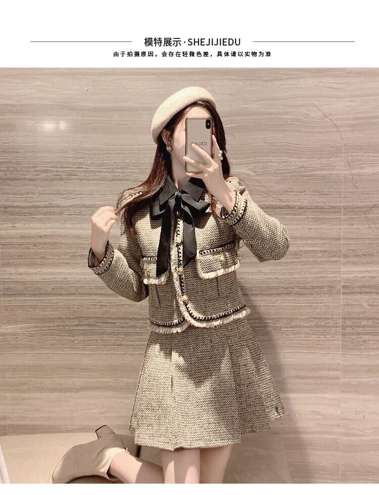 小さフレグランツイードセットシックジャケットコート+ウエストプリーツスカートスーツ冬ツーピースセット ウィンター 冬物