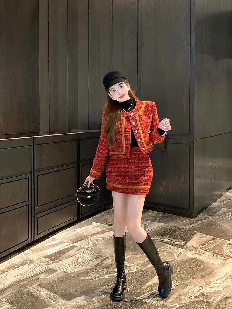 冬小さフレグランツイード 2 点セットウールジャケットコート + スカート 2 点セット衣装 ウィンター 冬物