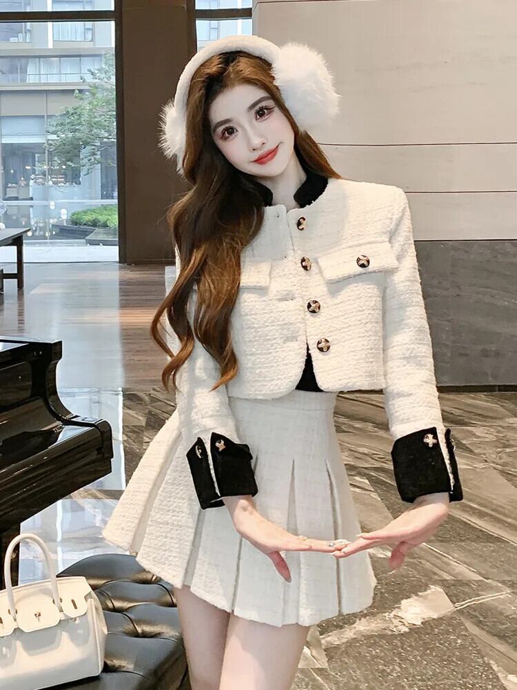 2024 春 2 点セット衣装スイートシックショートジャケットコート + プリーツスカートスーツツイード 2 点セット 大人ガーリー スウィート キュート カジュアル スプリング 春物