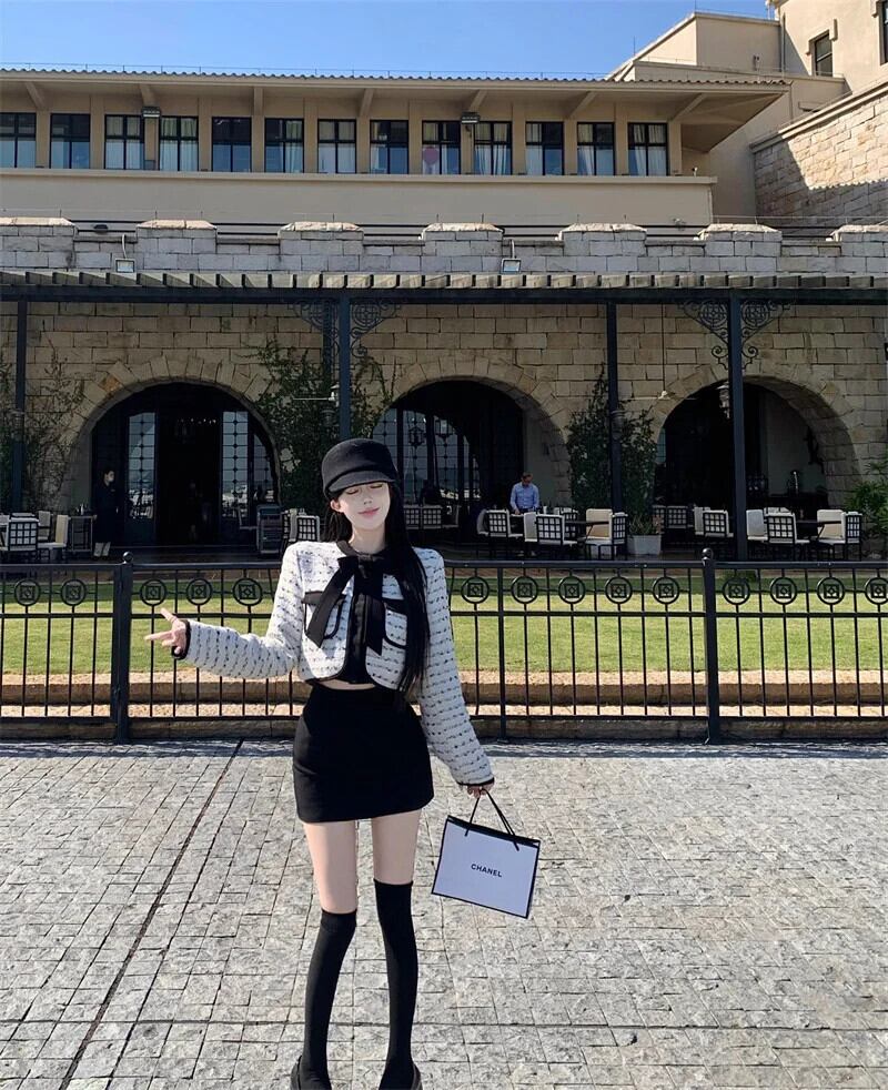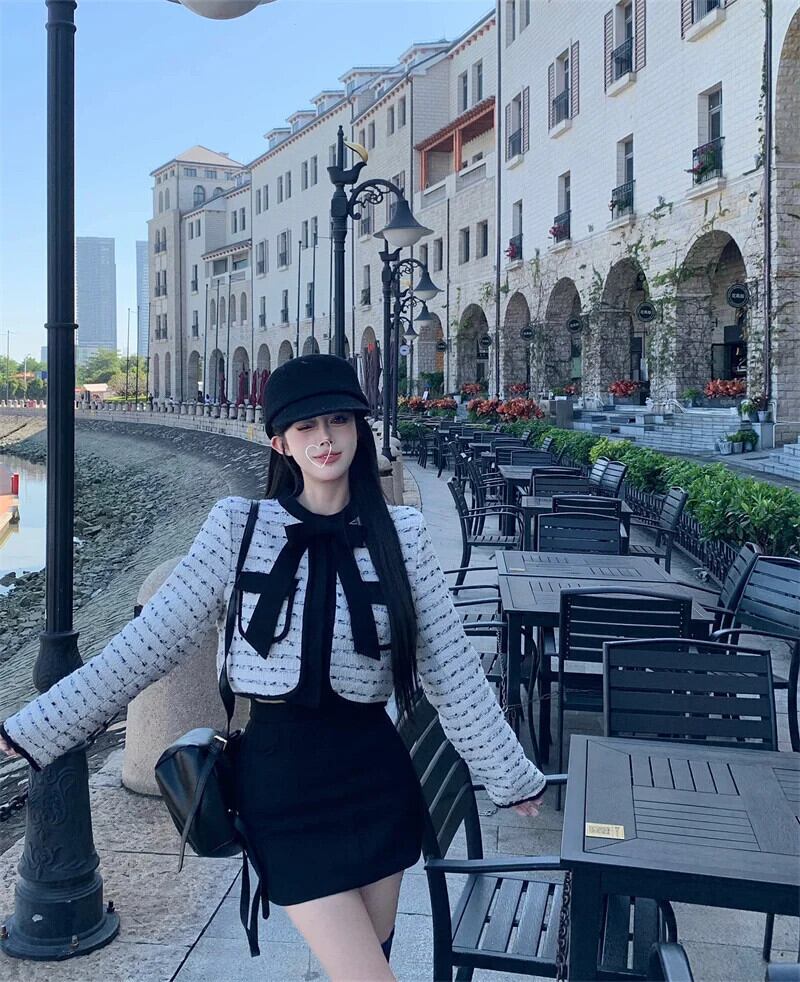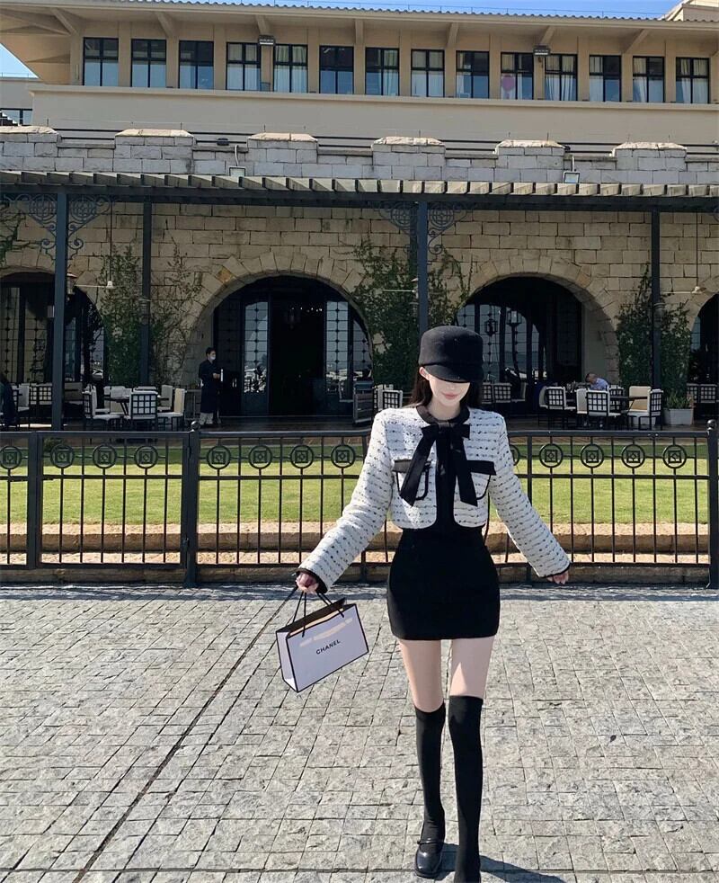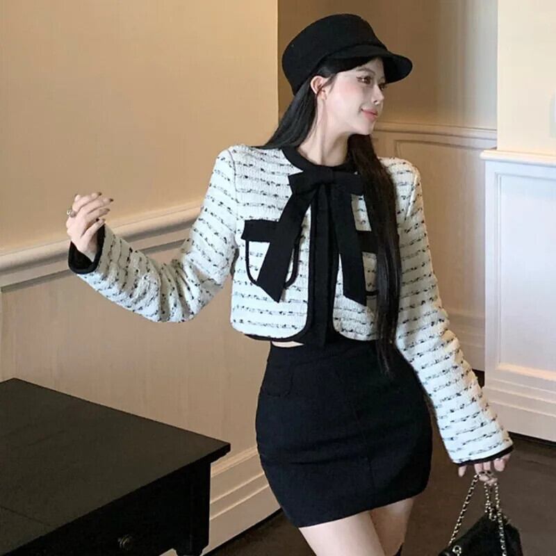 フランス 2 点セット衣装ボウジャケットコート + スカートツーピーススーツ Conjuntos Femininos リボン