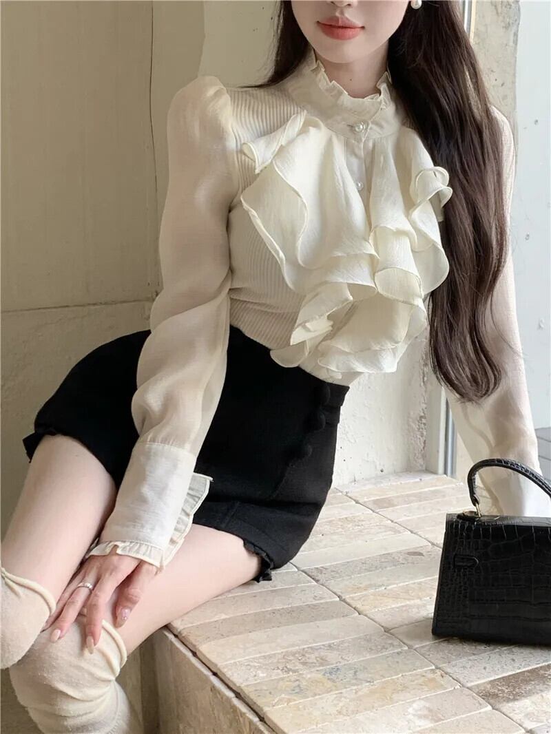 フランス蓮葉エッジジェントルシャツブラウストップ + ウエストショートセット 2024 春 OL ツーピースパンツスーツ スプリング 春物