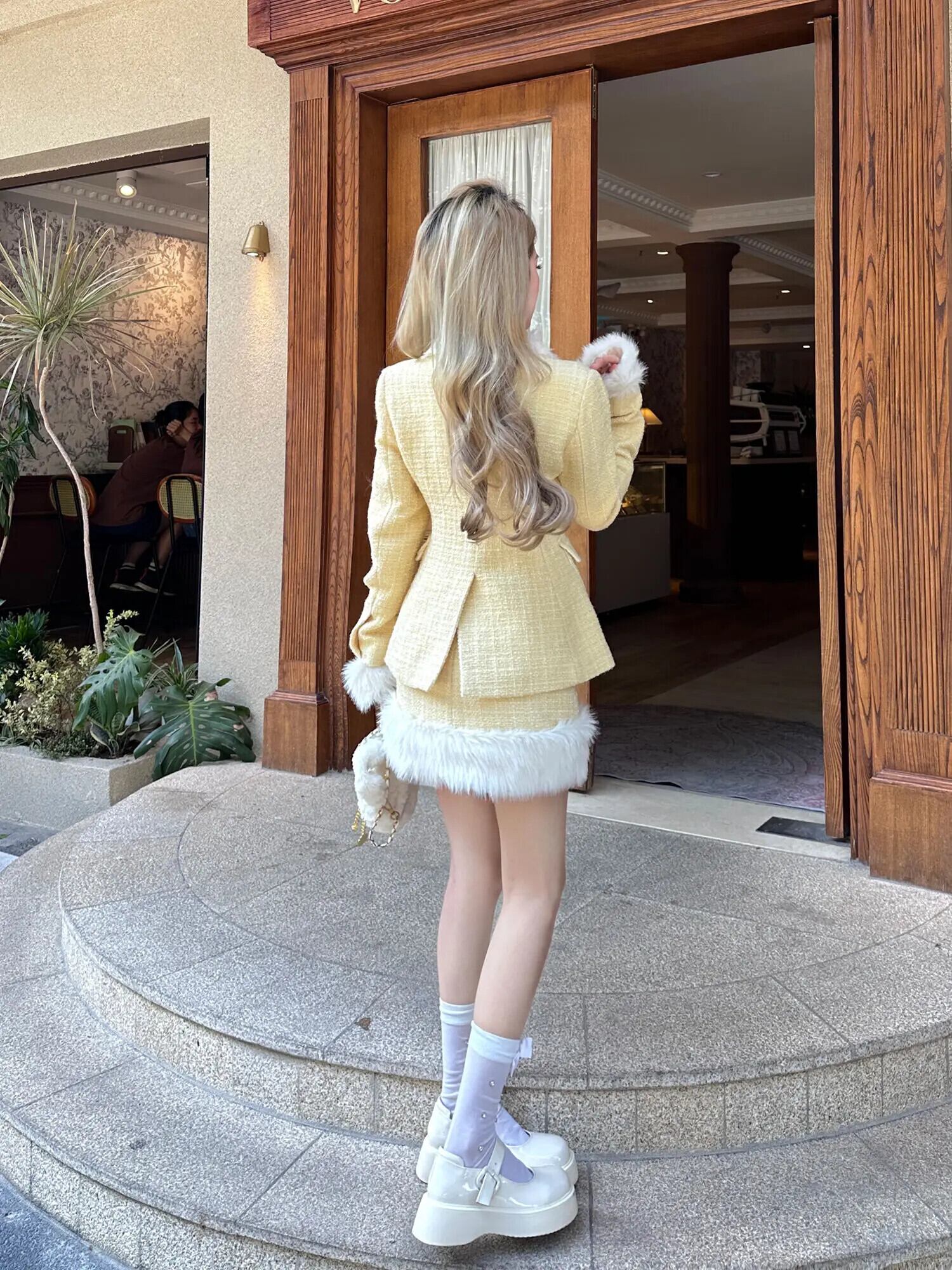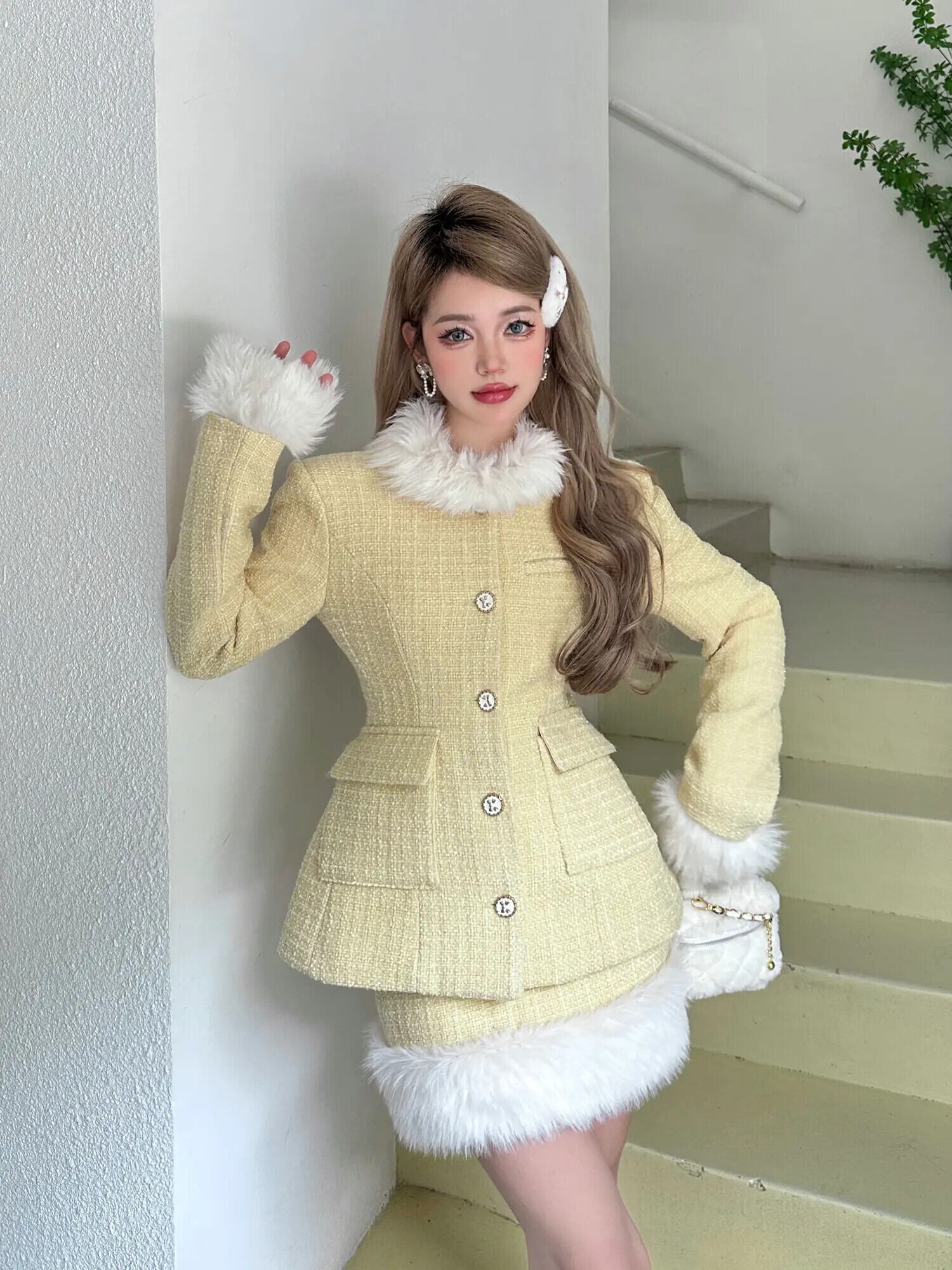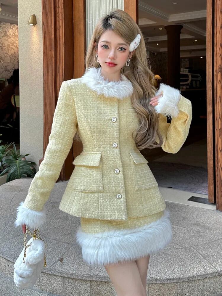 冬小さフレグランス 2 点セットフェイクカラーコート + スカートスーツ甘い衣装 大人ガーリー スウィート キュート カジュアル ウィンター 冬物 ファー